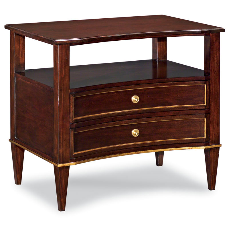 A wonderful table inspired by 19th Century Italian originals. The molded top rests over square corner posts that support two concave drawers below an open area for books or a clock. Finished on the back.Material: Hardwood solids and mahogany veneer