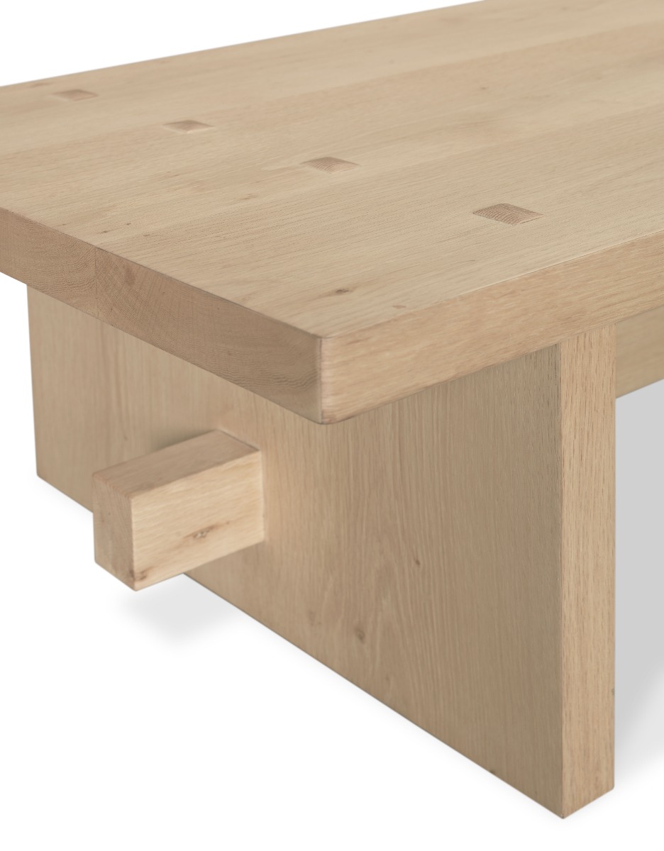An eye catching provincial low table with a wide planked top is elevated on slab ends joined by a low beam support.Material: oak solids and veneer