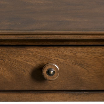 A lovely hall table designed in the spirit of the 19th century styles made famous by West Indies craftsmen of the era. A rectangular top with swirl Cerejeira resting over intricately turned multi ring corner posts that support two apron rail drawers and a low shelf.Material: Hardwood solids & Cerejeira veneer