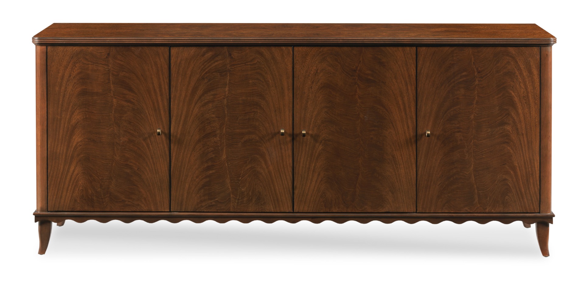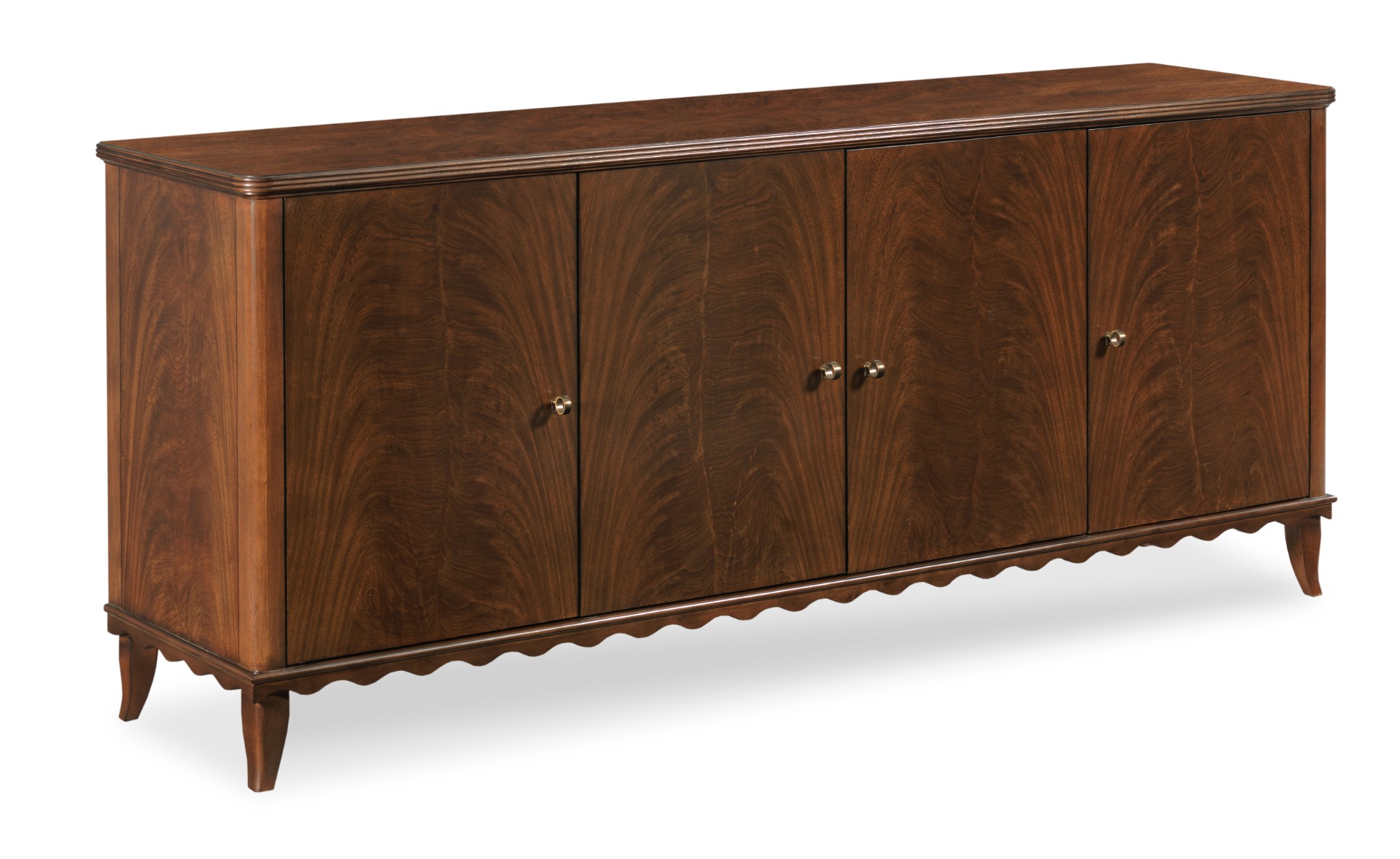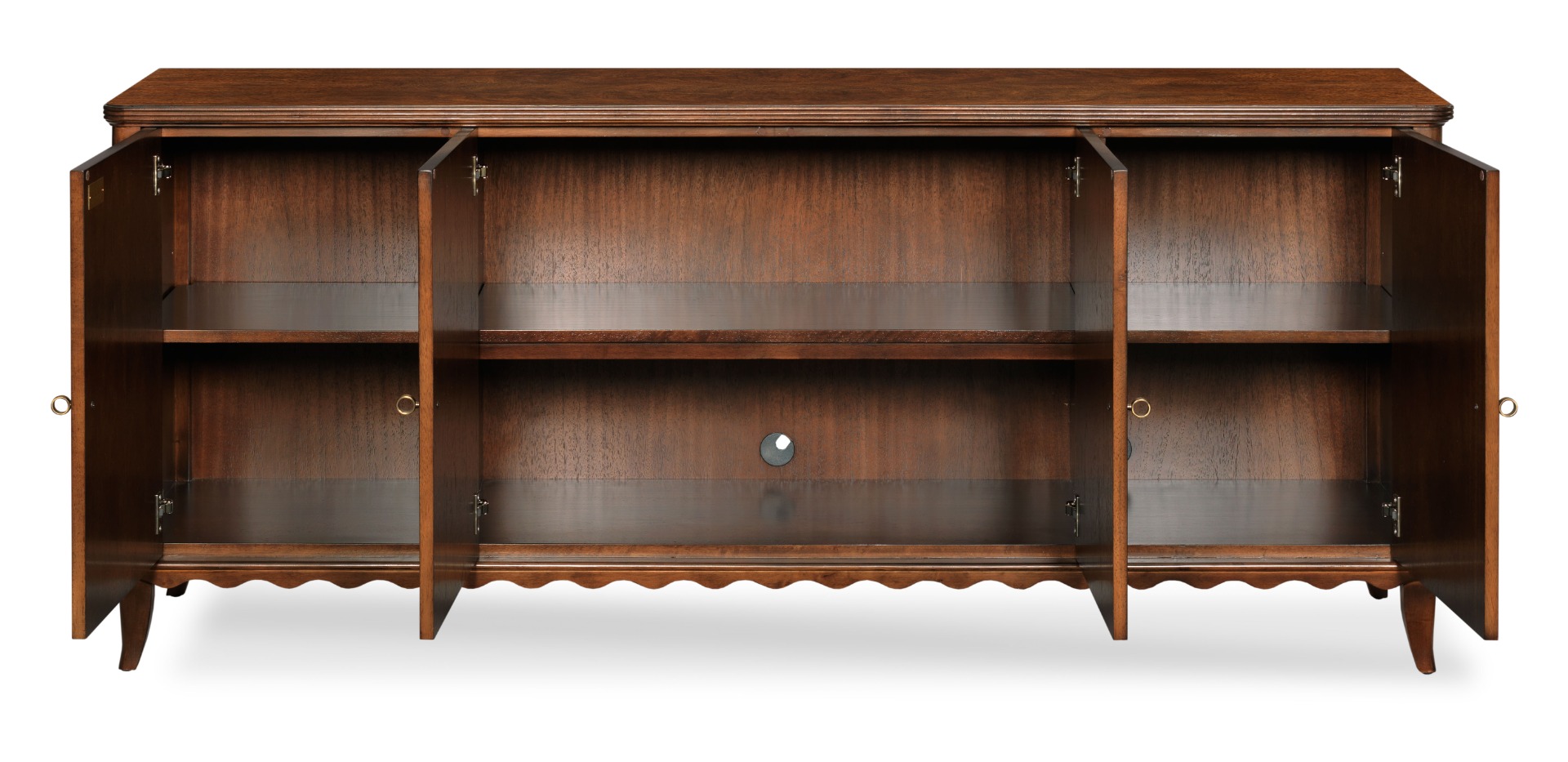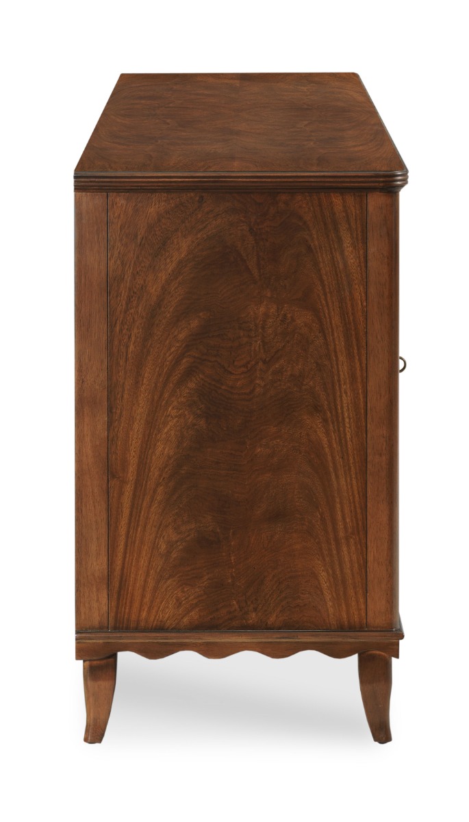 This versatile media cabinet is a striking addition crafted from durable hardwood solids with a rich finish and refined Cerejeira veneer. A Rococo-style wavy base adds graceful movement and classic European flair, enhancing its timeless warmth and elegant presence.Material: hardwood solids & Cerejeira veneer