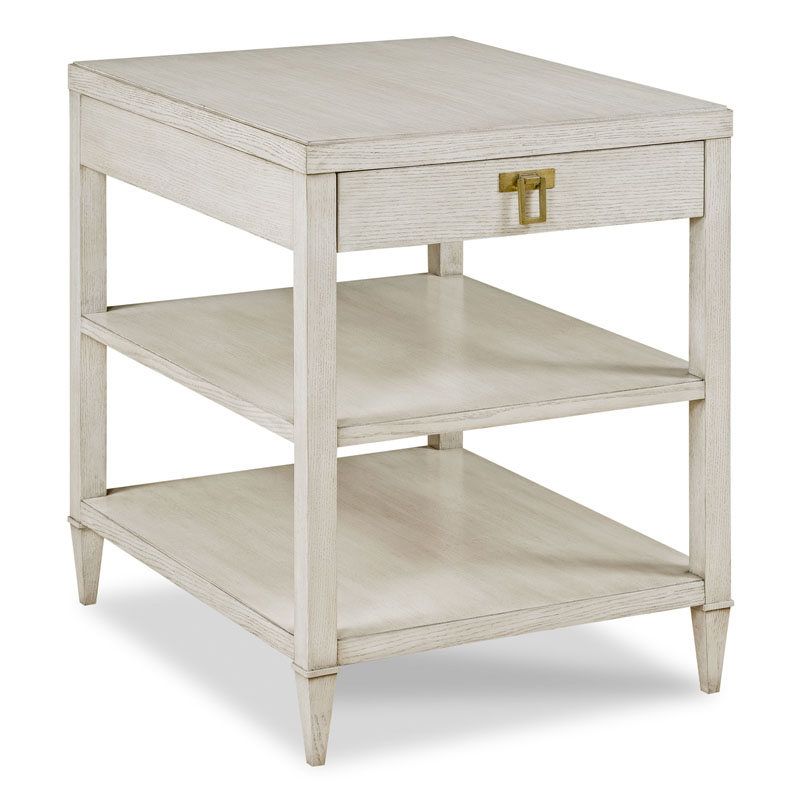 A rectangular top rests over four squared corner posts flanking an apron rail drawer above two stationary shelves.Material: Ash solids and ash veneer
