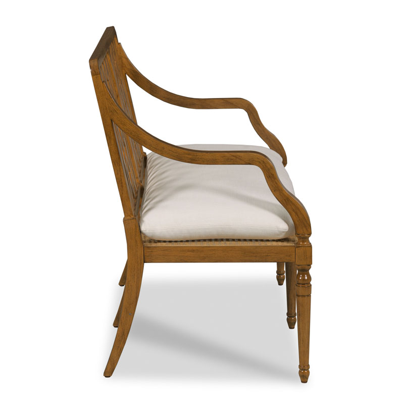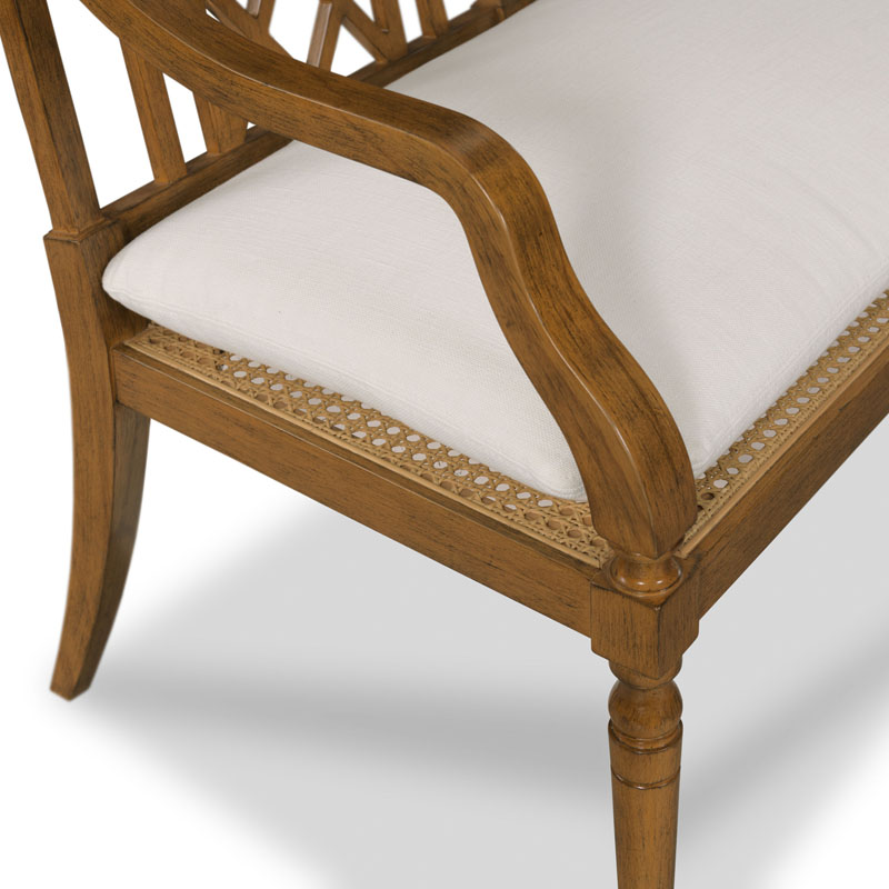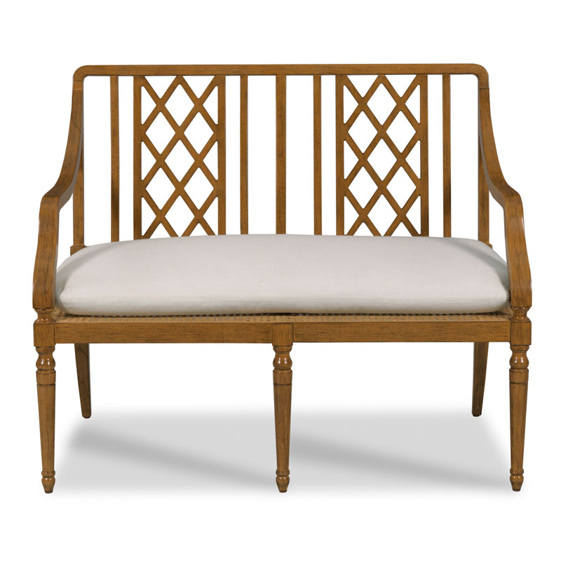 This lovely settee was adapted from the style books, The Cabinet Maker's and Upholsterer's Drawing Book, of Thomas Sheraton of the 18th century. The pierced fretwork back is elevated by turned front legs and graceful tapered flare legs at the back. The seat is accented with open traditional cane and a loose upholstered seat cushion.Material: Hardwood solids