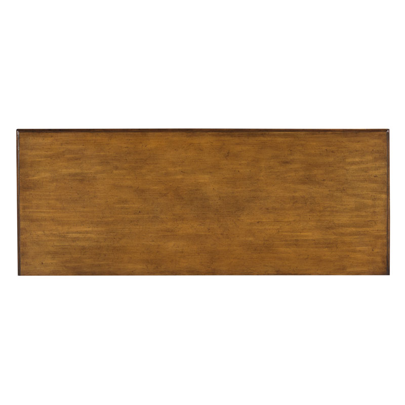A rectangular molded top is veneered with rich prima vera placed over four stylized bamboo legs accented by leather bound joinery that flank seven individual drawers.Material: Hardwood solids and prima vera veneer