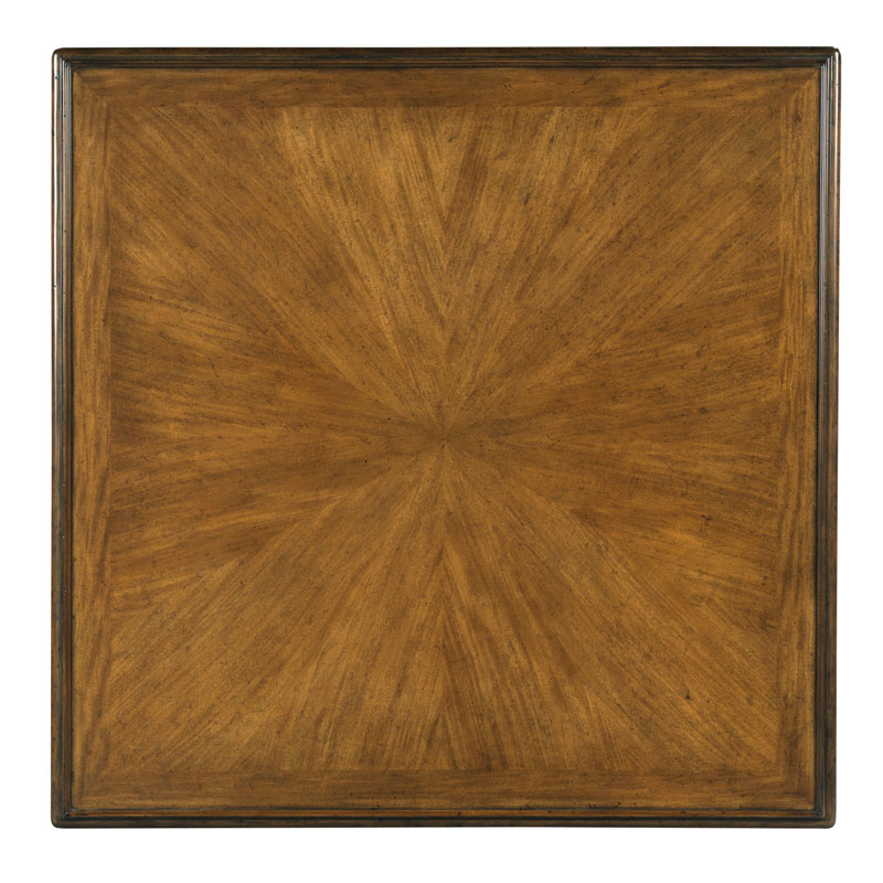 A molded square top rests over four turned faux bamboo legs that are joined by a low shelf that is bound to the legs with leather.Material: Hardwood solids and prima vera veneer