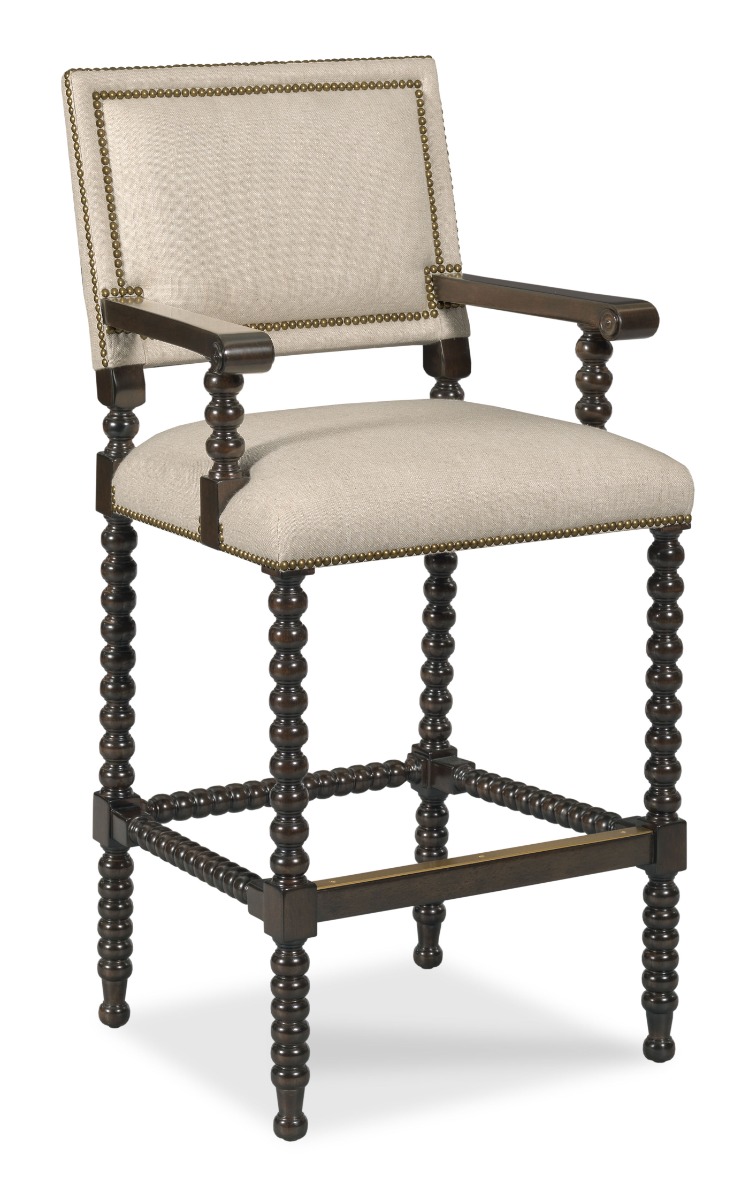 A handsome bar seat designed in the spirit of 17th Century English originals. An upholstered back, accented with nail trim is elevated over an upholstered seat elevated on spool turned legs and stretchers.Material: Hardwood solids
