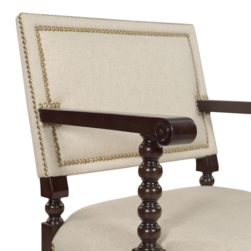 A handsome chair designed in the spirit of 17th century English originals. An upholstered back is accented with nail head trim over an upholstered seat elevated on spool turned legs joined by spool turned stretchers.Material: Hardwood solids