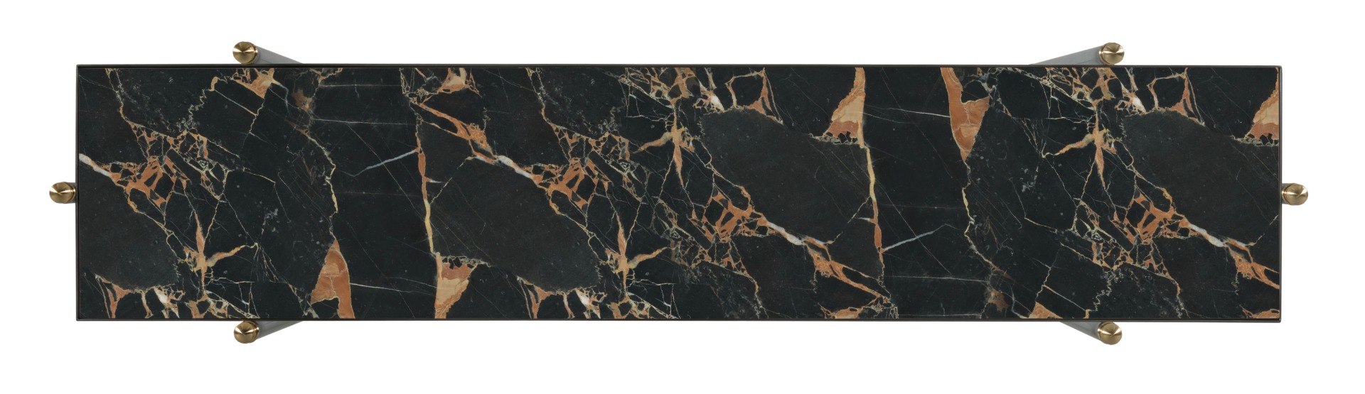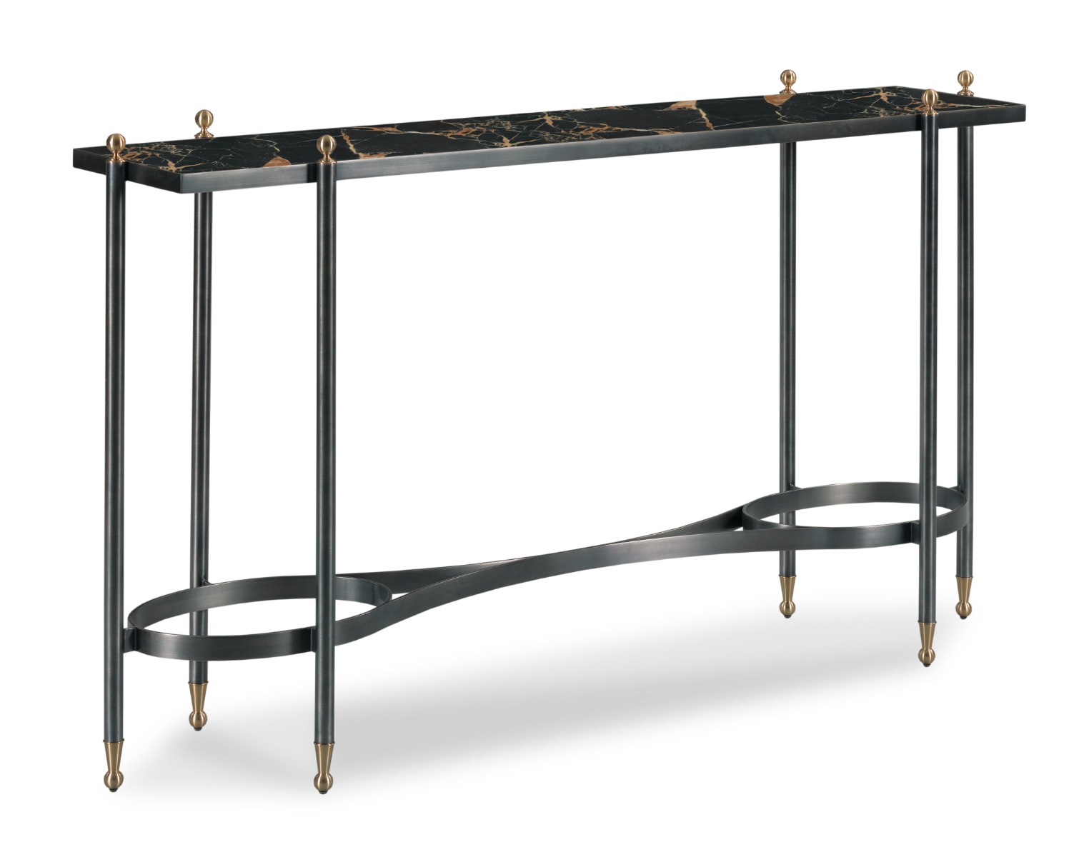 A lovely table adapted from mid 19th Century French garden furniture. Round metal posts crowned with brass finials support a rectangular inset stone top over a curvaceous and intricate metal stretcher.Material: stone, metal and brass