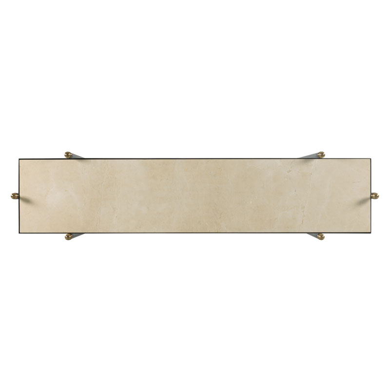 A lovely table adapted from mid 19th Century French garden furniture. Round metal posts crowned with brass finials support a rectangular inset stone top over a curvaceous and intricate metal stretcher.Material: stone, metal and brass
