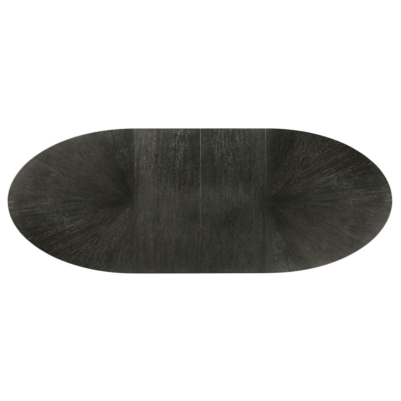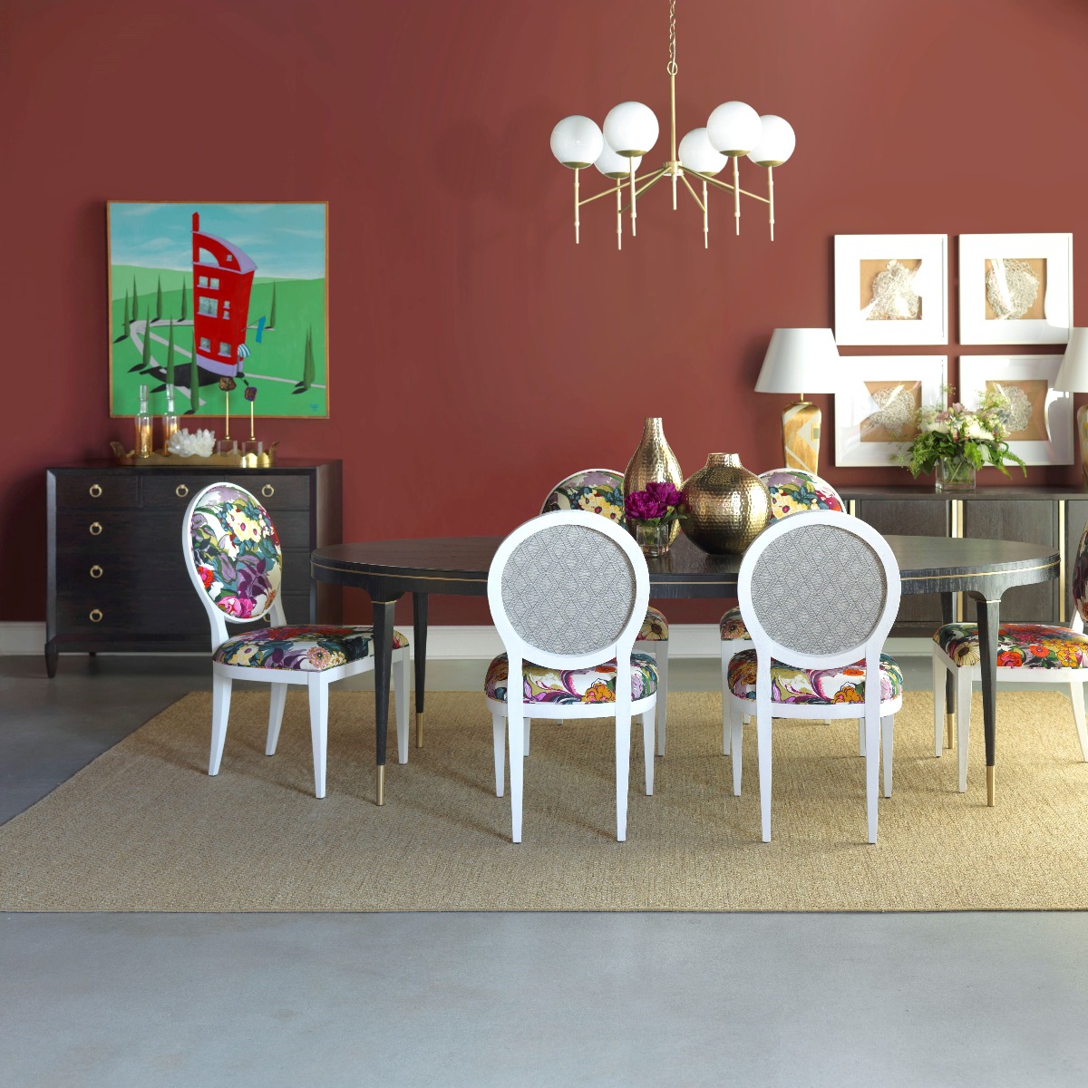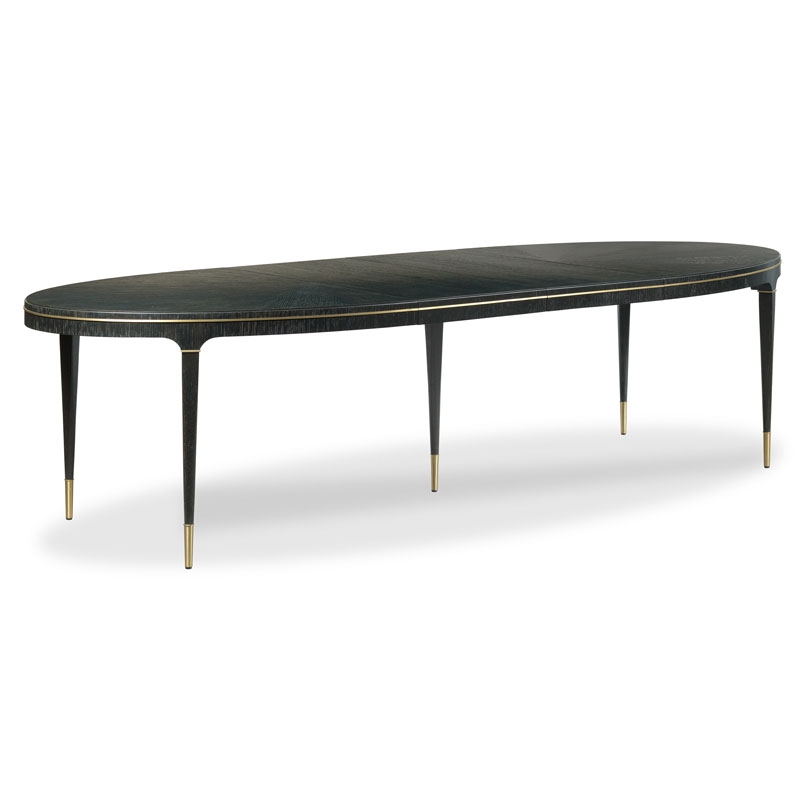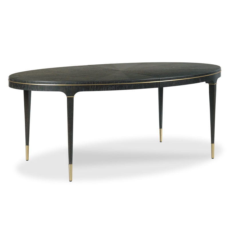 A pleasing design inspired by early 20th century French originals. A graceful compressed oval top is veneered with quartered oak in a radiating pattern resting over four squared posts that terminate to rounded brass sabots.Material: Oak solids and oak veneer