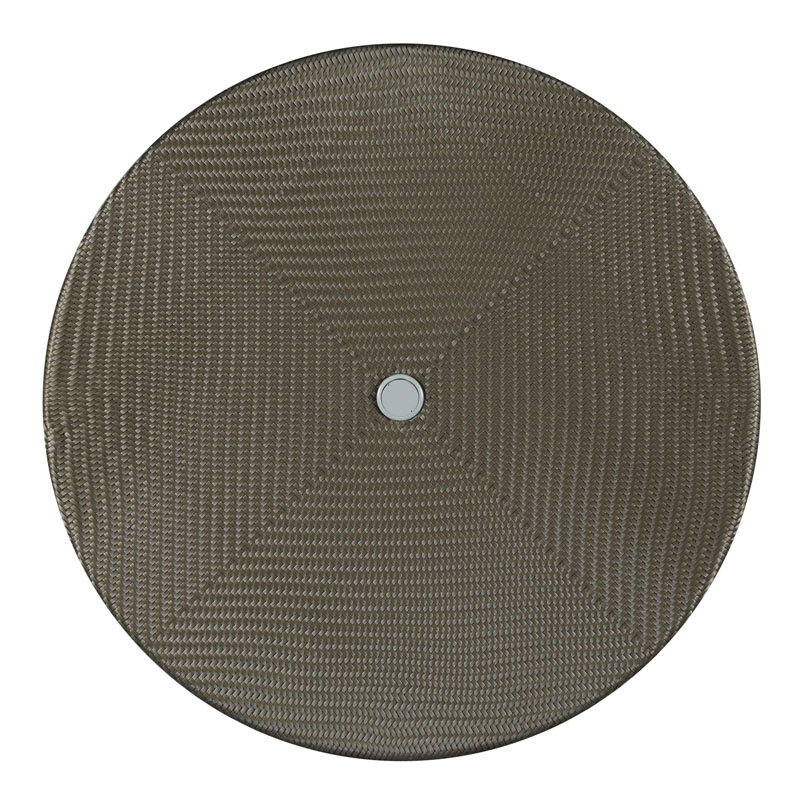 A round woven top is mounted to a woven base with four rounded tapering legs.Material: Powder Coated Aluminum with Handwoven Synthetic Fiber