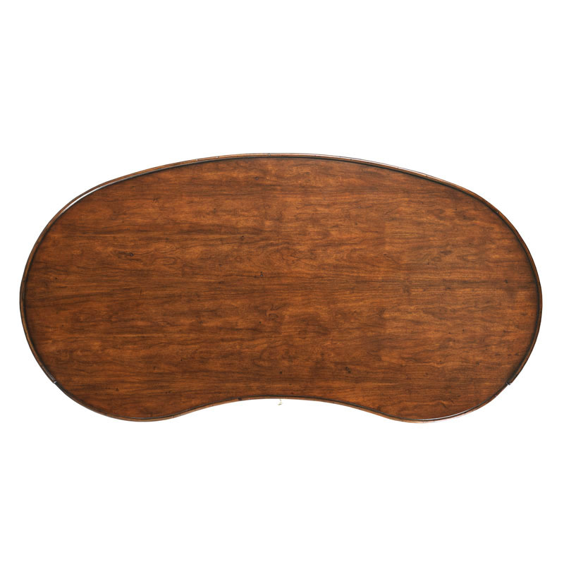 A serpentine kidney shaped cherry veneered top rests over a base with shaped apron rails fitted with a handy drawer. The desk is elevated on five gracefully tapered legs joined by wavy stretchers.Material: Hardwood solids and cherry veneer