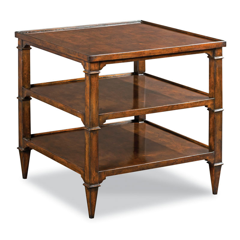 A galleried square top rests over four square corner posts adorned with delicate molded details. The table is fitted with a middle and low shelf for display.Material: Hardwood solids and cherry veneer