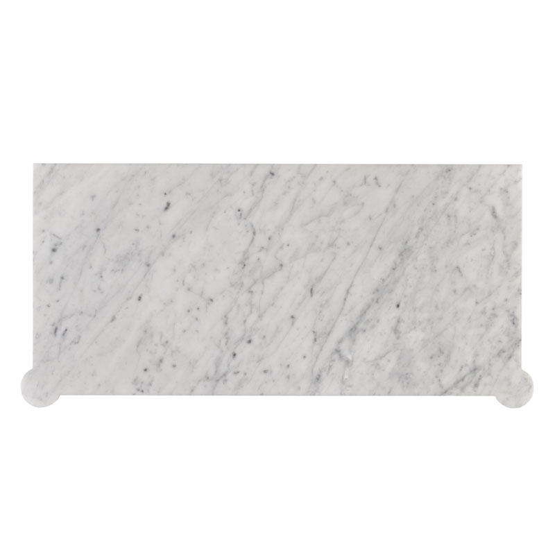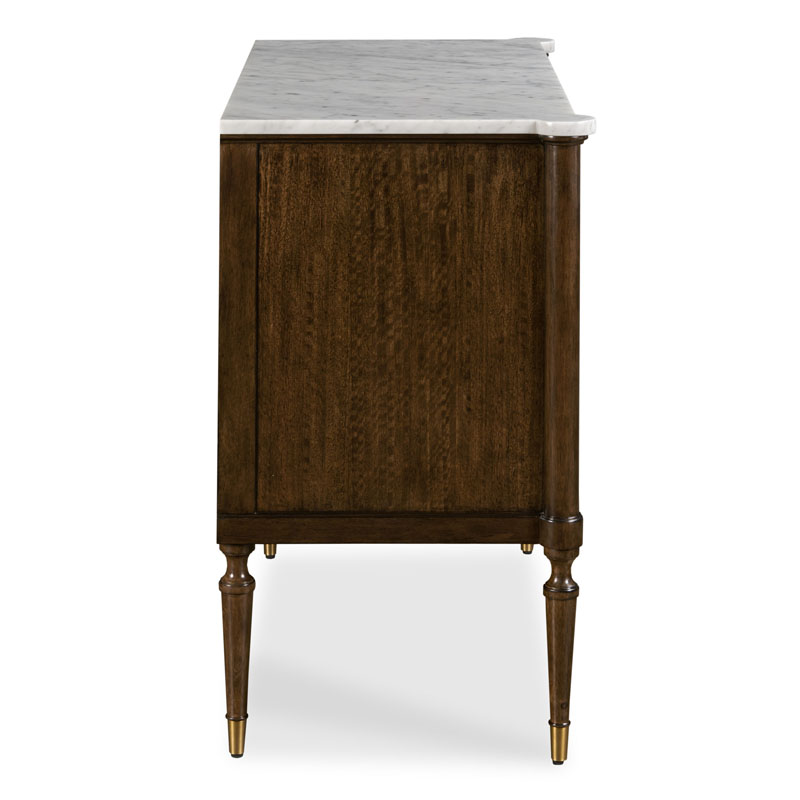A handsome bedside chest styled in the spirit of late 18th century French Directoire originals with turned round corner posts that flank three individual drawers. Framed with a simple molding and mounted with modern brass hardware below a Carrara marble top.Material: Hardwood solids and walnut veneer with Carrara marble