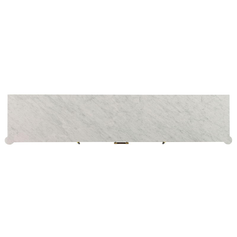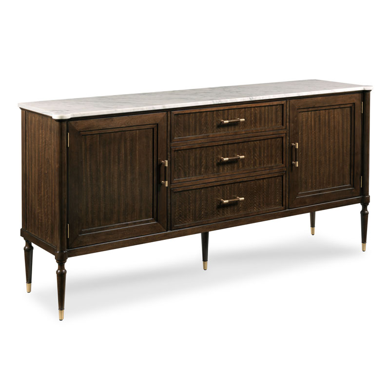 A handsome sideboard styled in the spirit of late 18th Century French Directoire originals with turned round corner posts that flank a storage area with adjustable shelving and three drawers.Material: Hardwood Solids & Eucalyptus Veneer with Carrara Marble