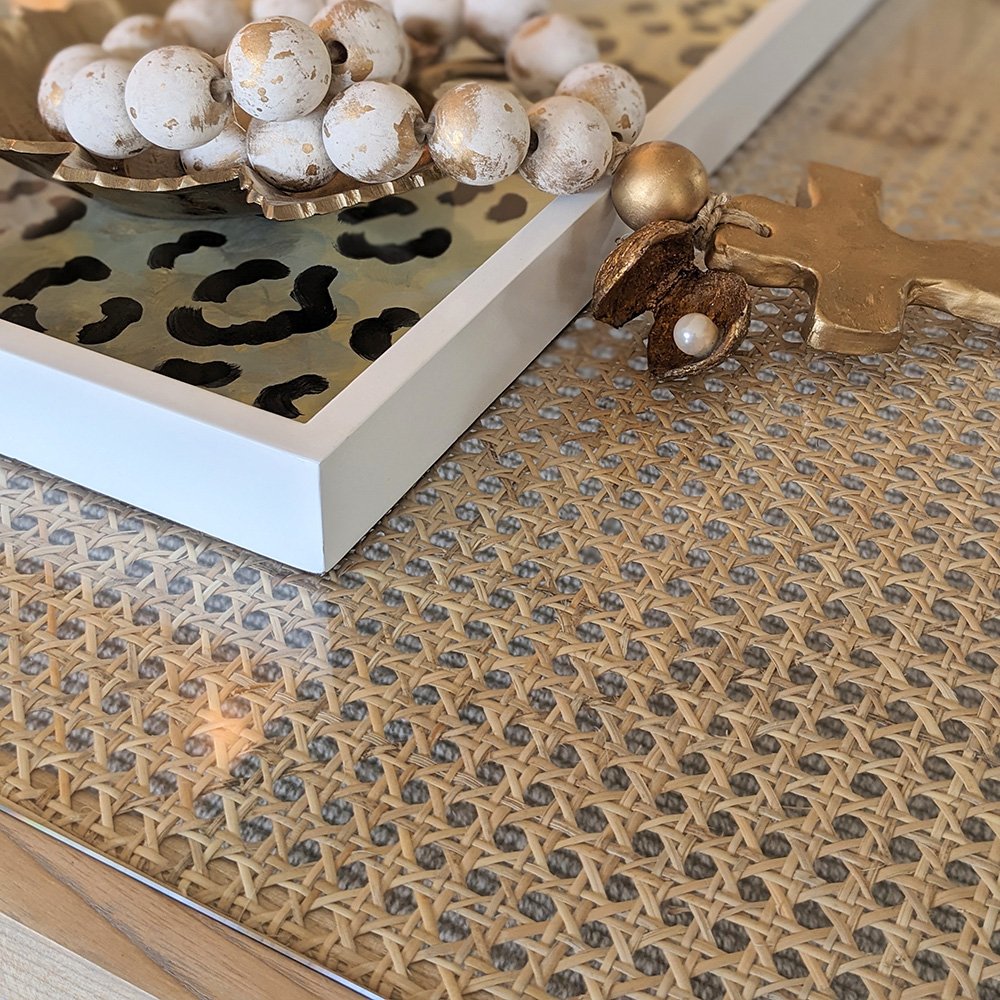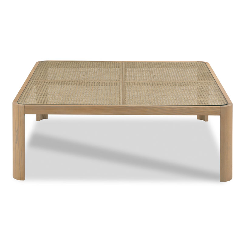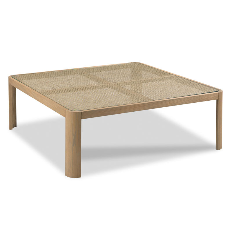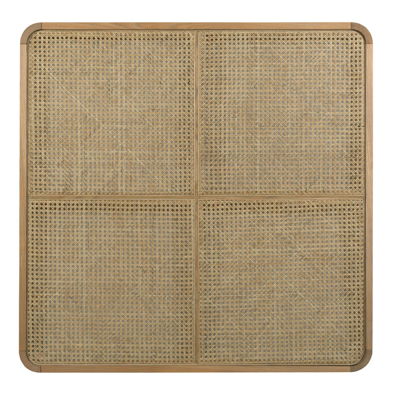 Clean lines and minimalism defines the design of the Mirada table, an inset glass top is accented with open woven cane beneath elevated on gently quarter rounded legs.Material: Ash solids, natural cane, and 3/8" tempered glass