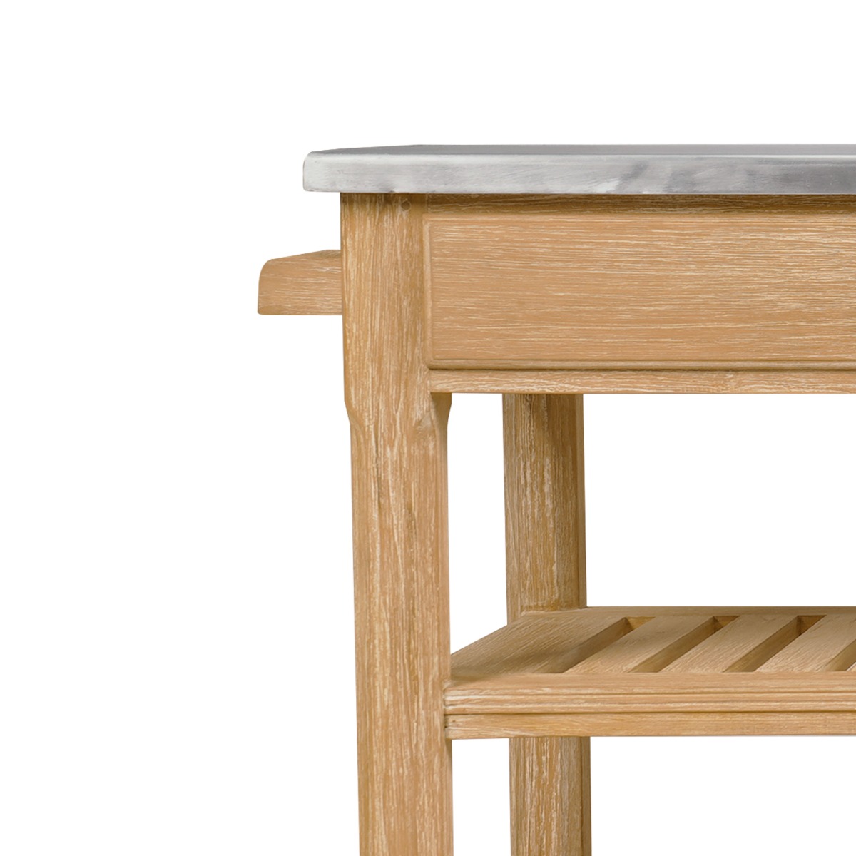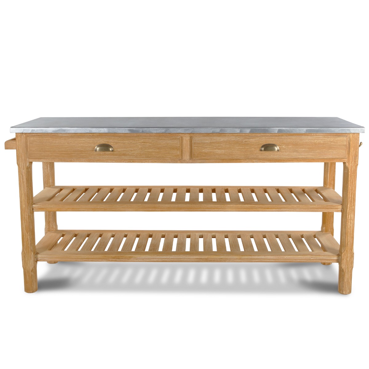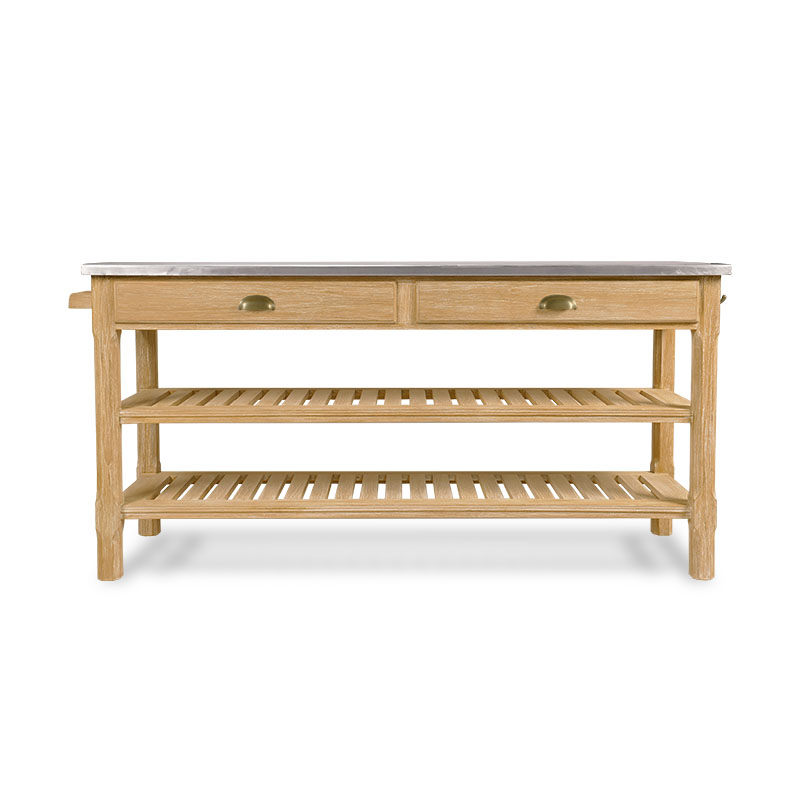 Inspired by the Arts and Crafts style movement from the mid 19th century, features a rectangular top resting over sturdy chamfered posts and an apron rail that is fitted with two drawers over two handy shelves.Material: Teak with brushed aluminum top
