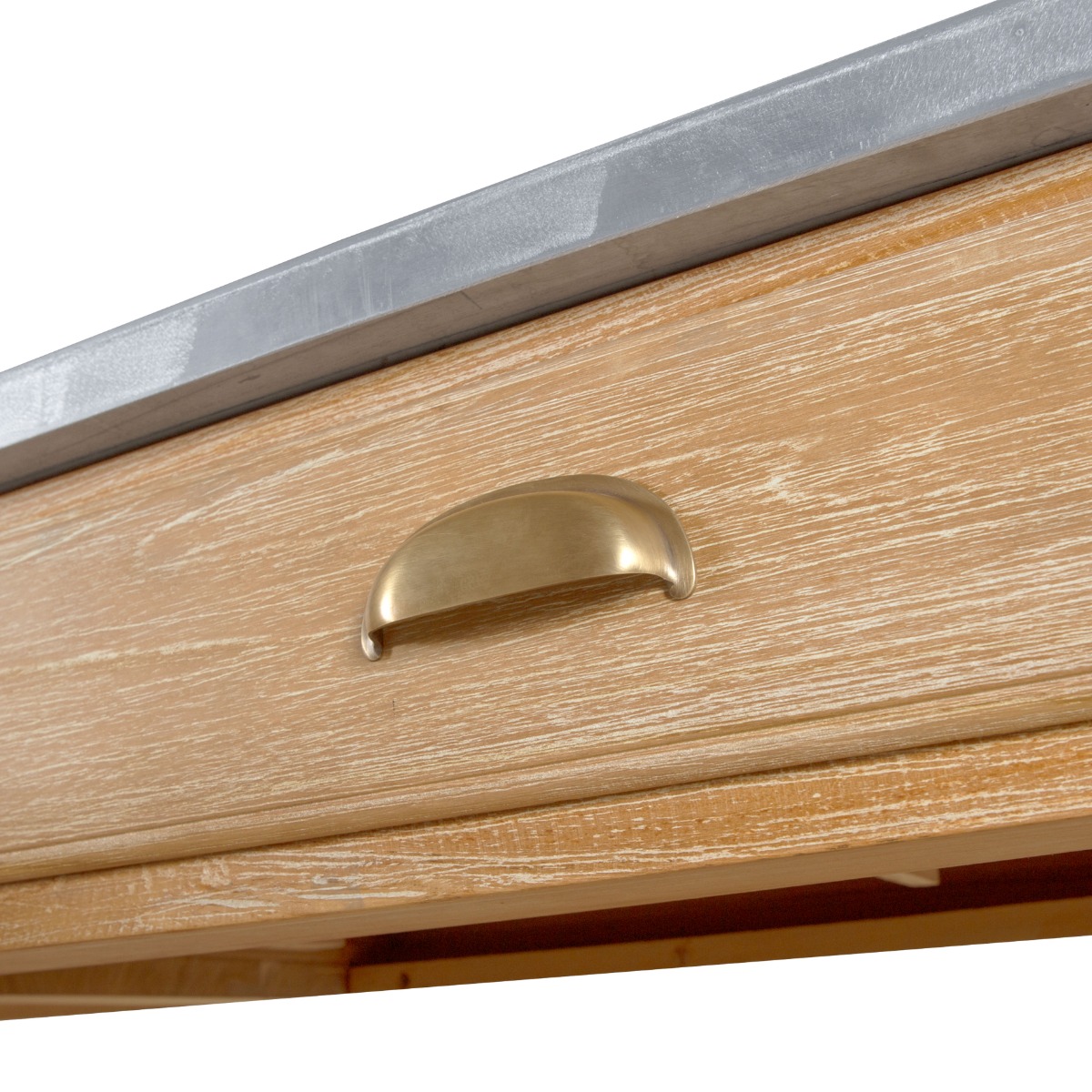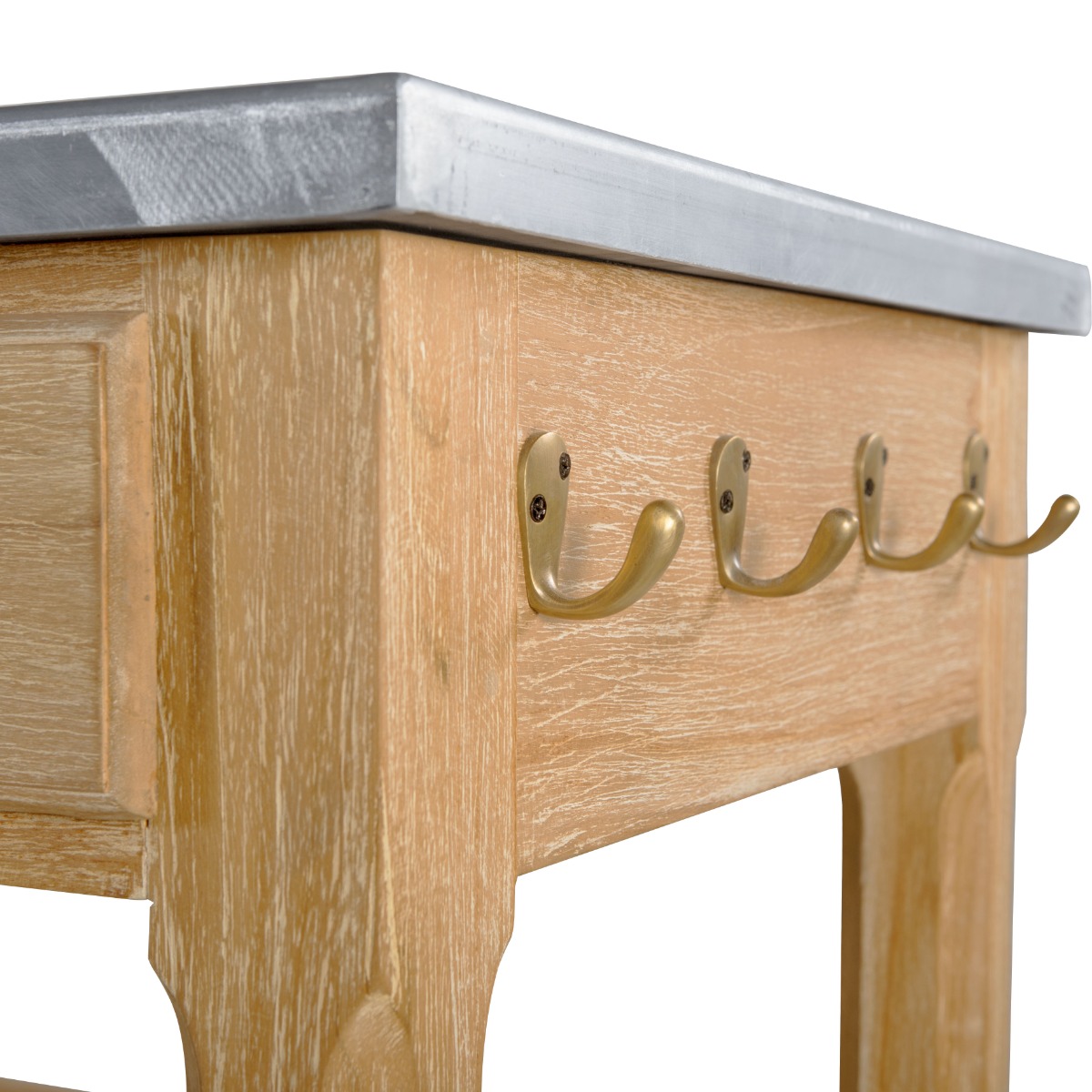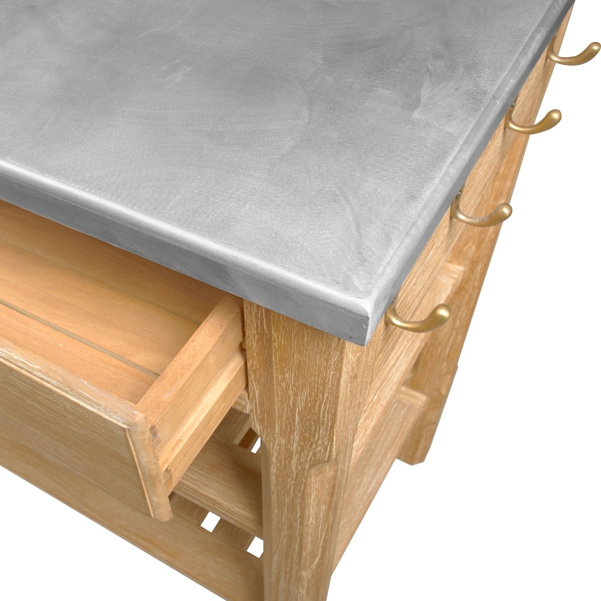Inspired by the Arts and Crafts style movement from the mid 19th century, features a rectangular top resting over sturdy chamfered posts and an apron rail that is fitted with two drawers over two handy shelves.Material: Teak with brushed aluminum top