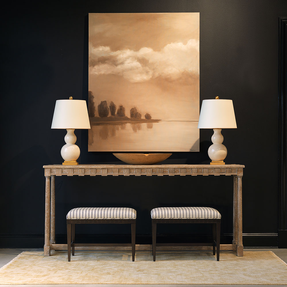 A rectangular upholstered seat rests over side rails that are overlaid with lacey pierced fretwork. The bench is raised on square tapering posts.Material: Hardwood solids