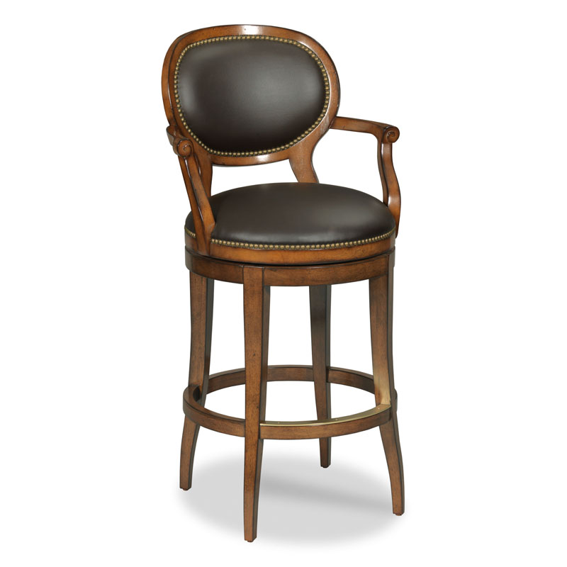 A graceful bar stool built for comfort. An upholstered oval back accented with brass nails is situated above an upholstered swivel seat raised by shaped legs.Material: Hardwood solids