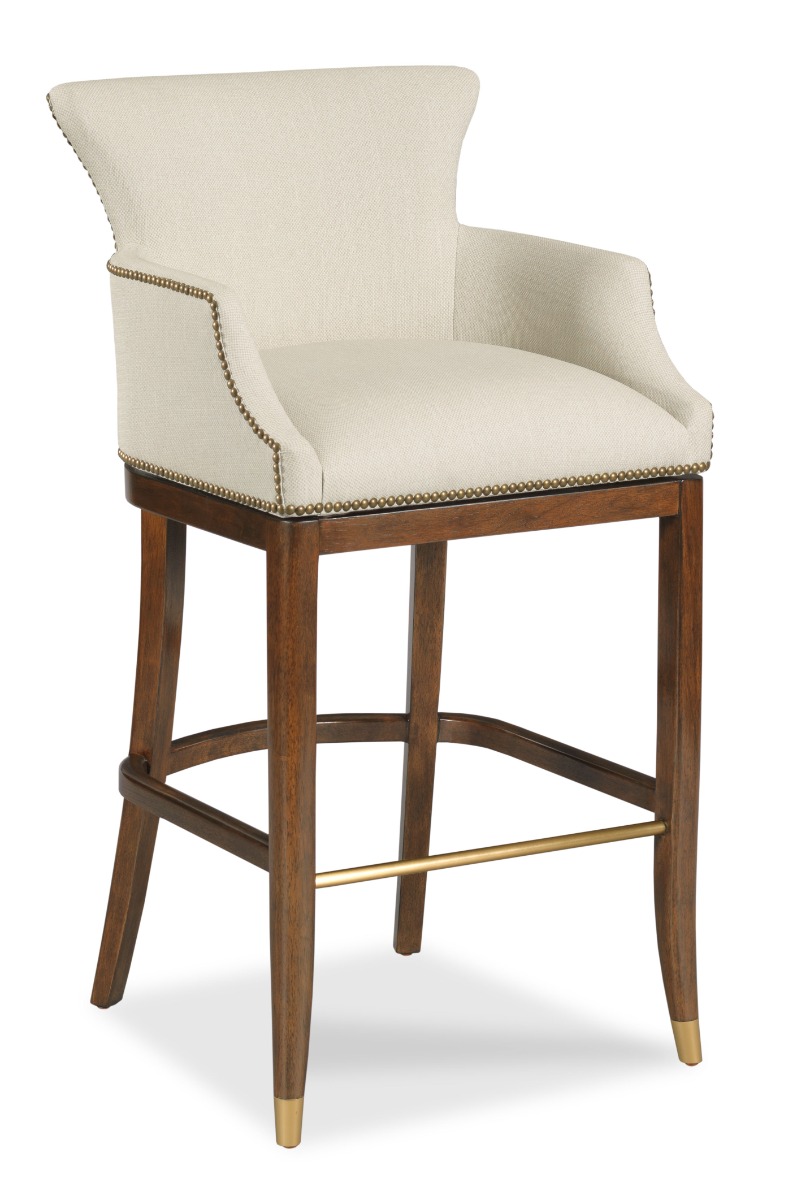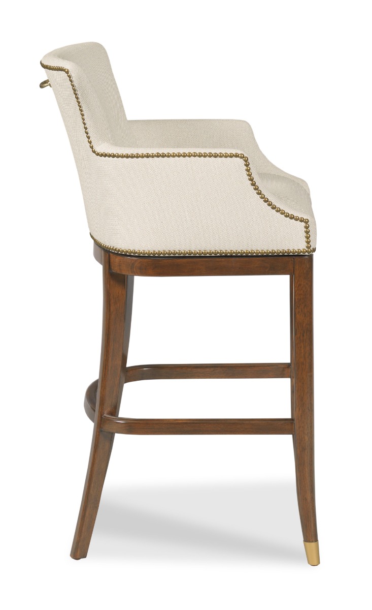 A curved upholstered back with descending curved arms over an upholstered seat elevated by tapering saber legs.Material: Hardwood solids