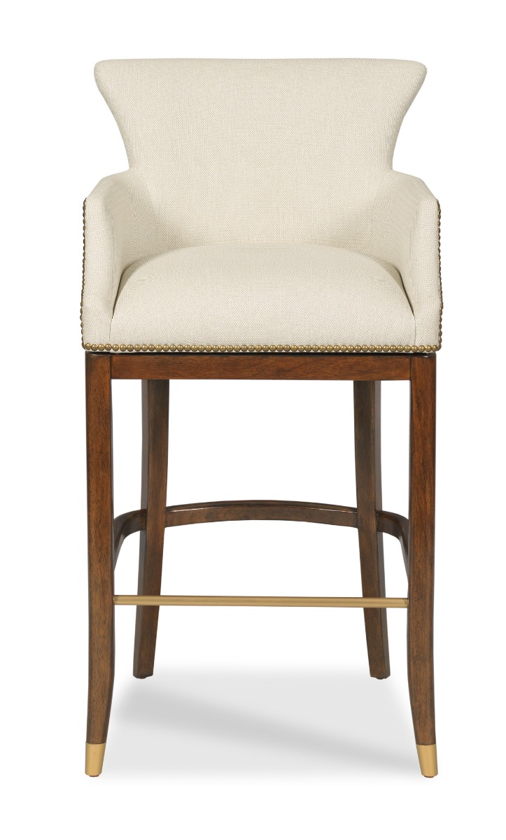 A curved upholstered back with descending curved arms over an upholstered seat elevated by tapering saber legs.Material: Hardwood solids