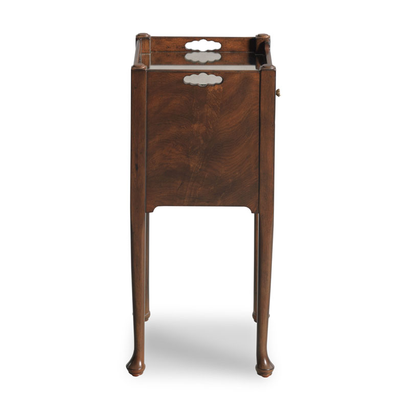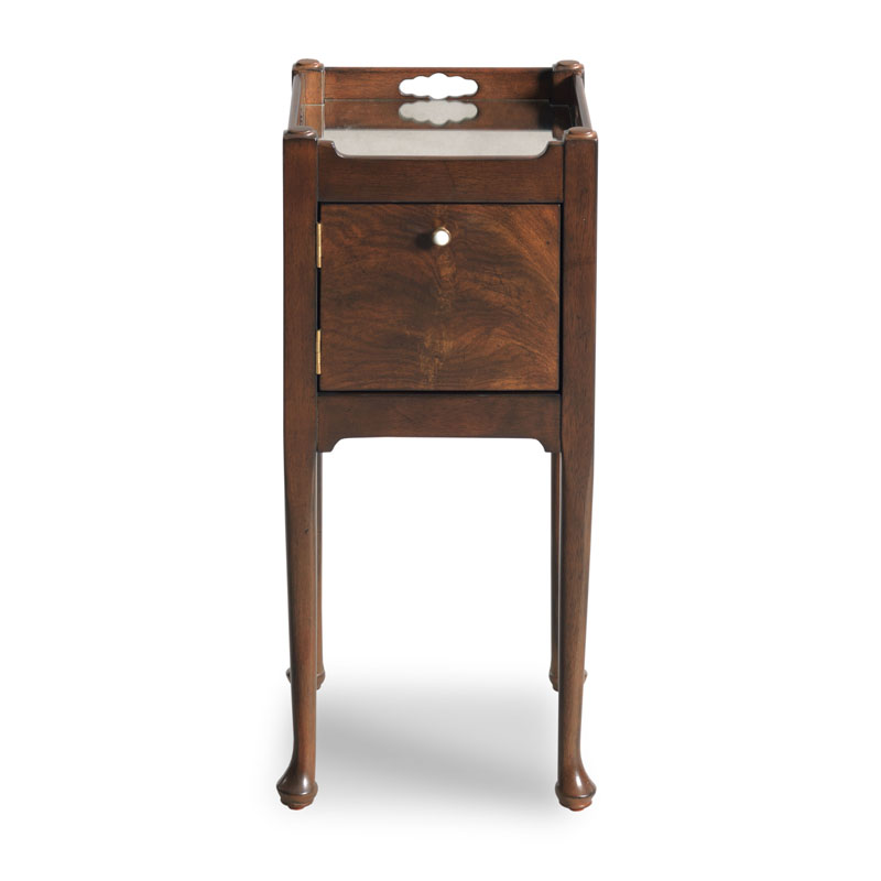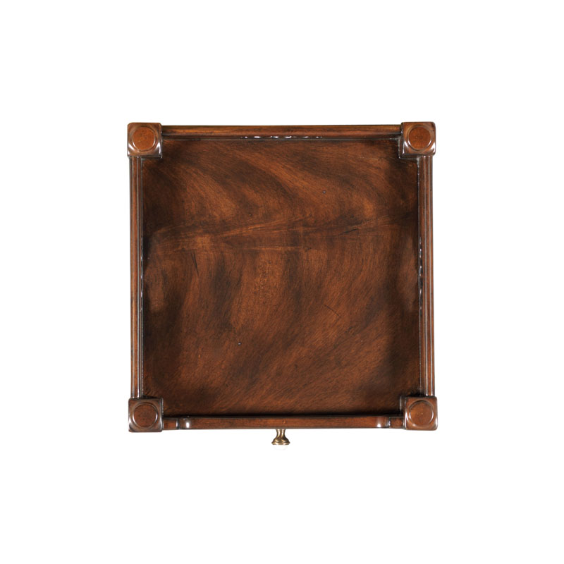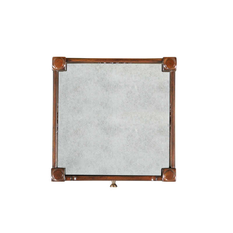 An adorable table designed in the spirit of 18th Century English originals with a square removable antiqued glass top elevated on stylized cabriole legs joined by veneered side panels and a small hinged door that hides a small storage area.Material: Hardwood Solids, Cerejeira Veneer & Antique Mirror
