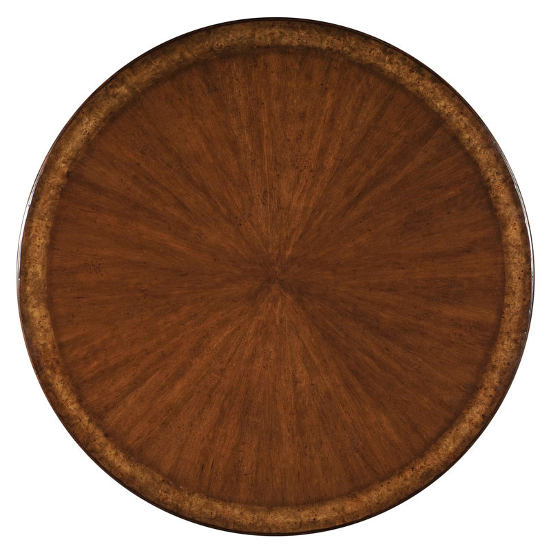 A pedestal table with handsome traditional styling has a molded round top above a robust multi-ringed carved column that rests on a round base.Material: Acacia solids and hand-planed cherry veneer
