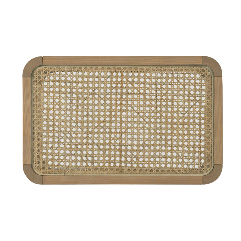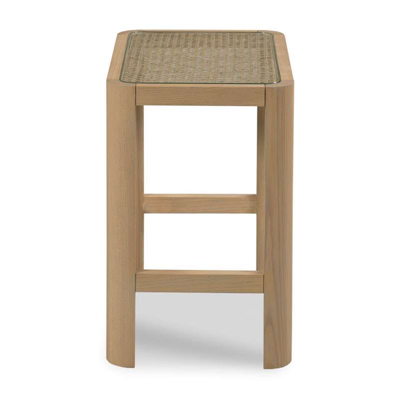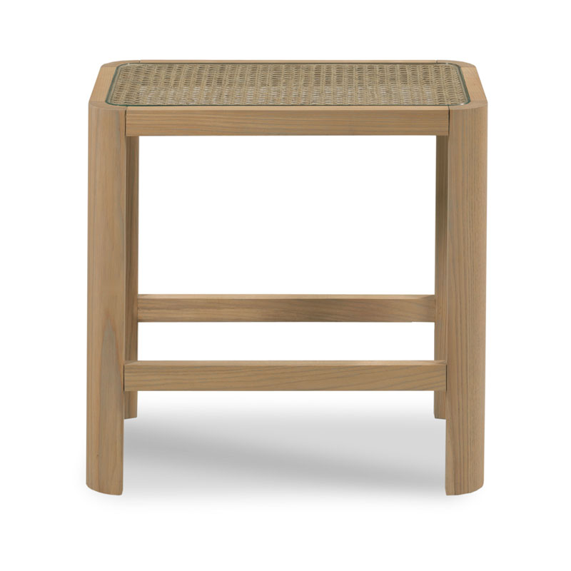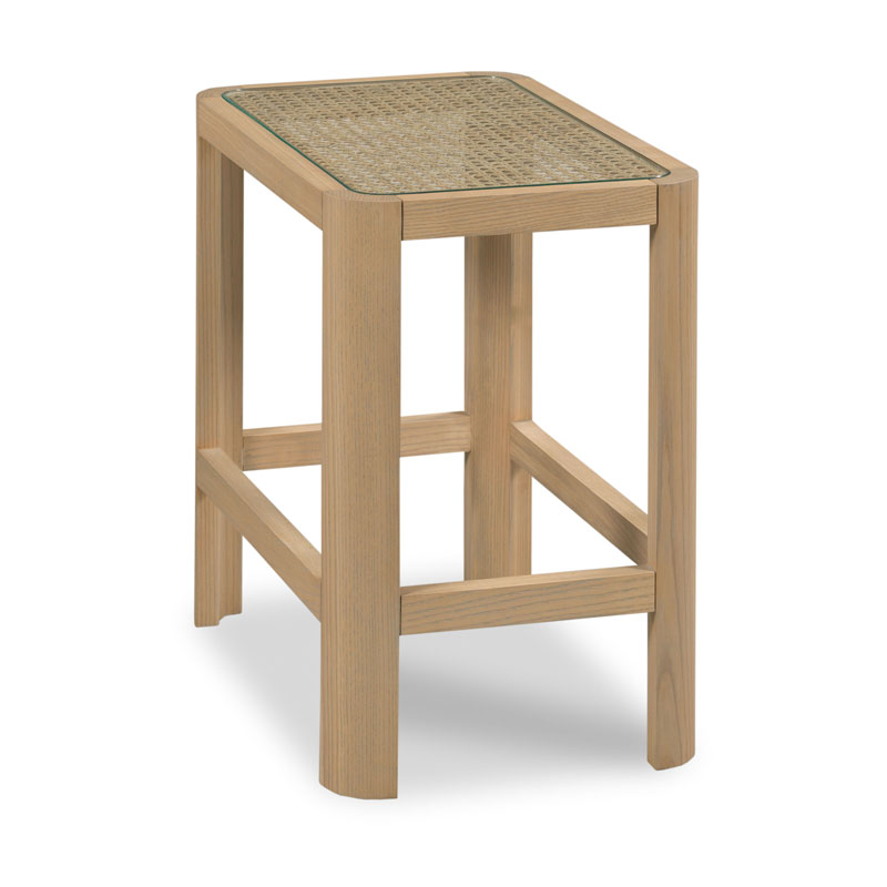 Clean lines and minimalism define this handy table. A rectangular inset glass top is accented with open traditional cane underneath supported by quarter round corner posts.Material: Ash solids and veneer with 3/8 tempered glass