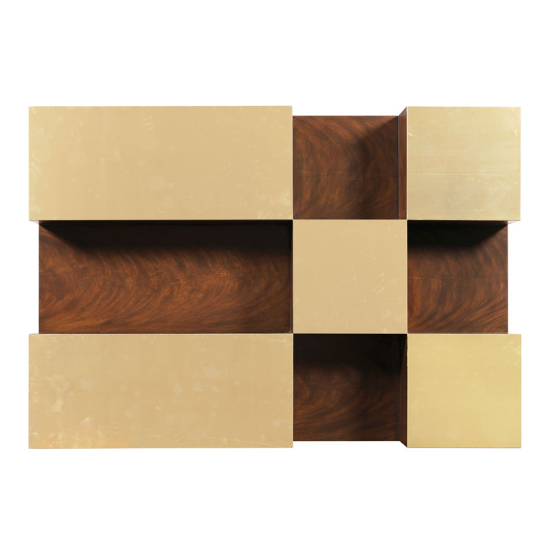 A curious modern low table elevated on a recessed plinth base with unlacquered brass panels on top and recesses for books or display below.Material: Hardwood Solids, Cerejeira Veneer & Sheet Brass