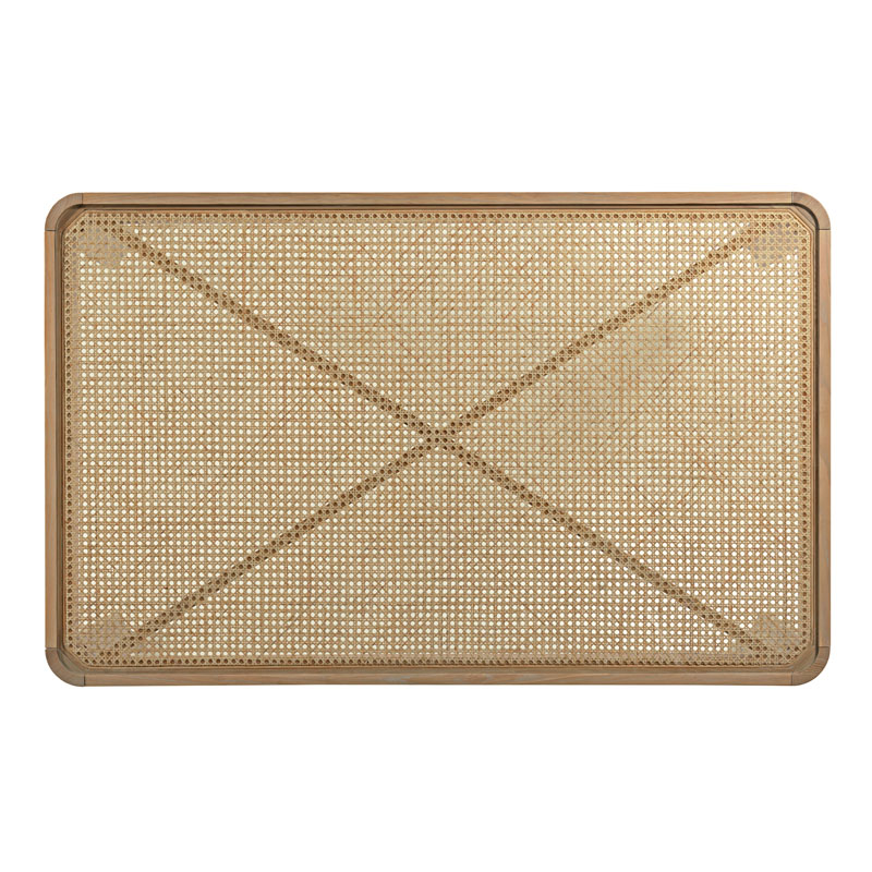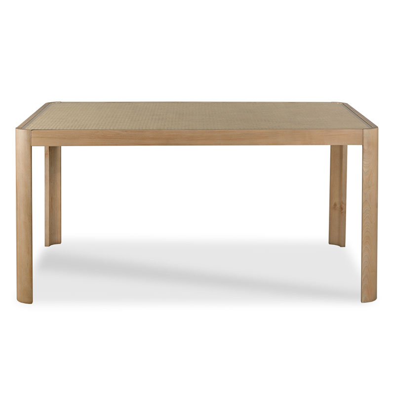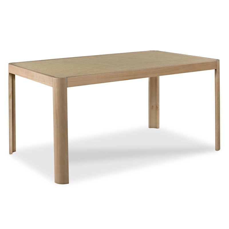 This well proportined dining table has a mid-century flair. Details include curved ash legs and a top adorned with intricate cane weaving and inset glass, adding a touch of vintage charm and texture.Material: Ash solids and veneer, natural cane, and 3/8" tempered glass