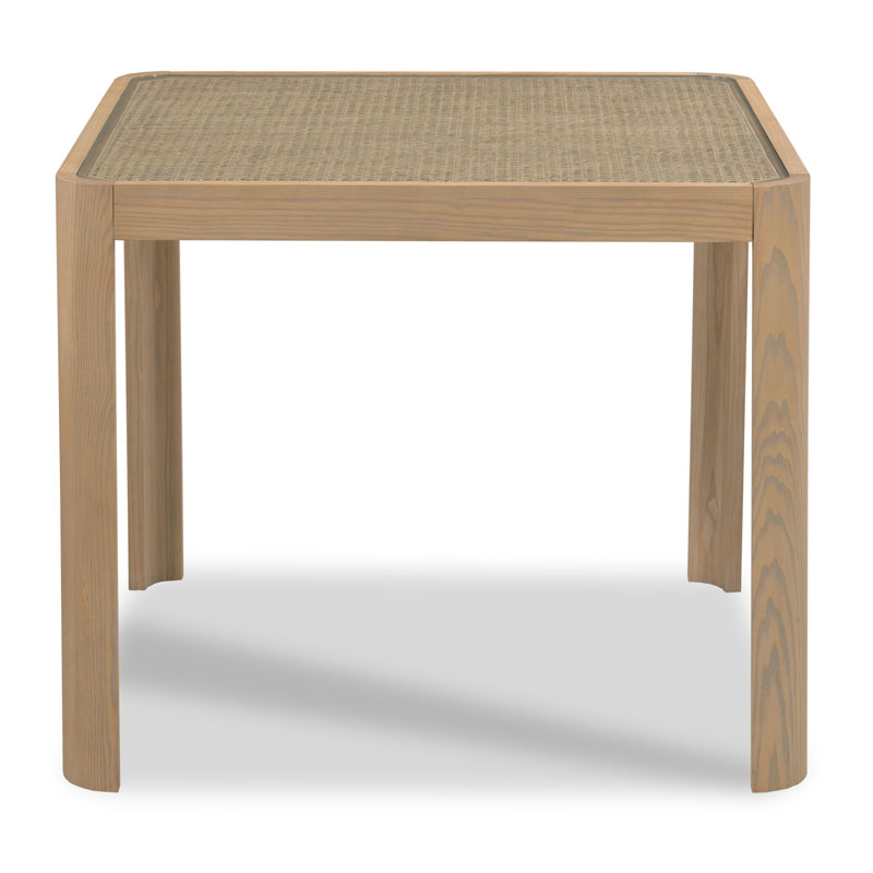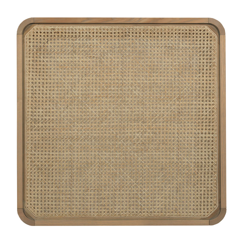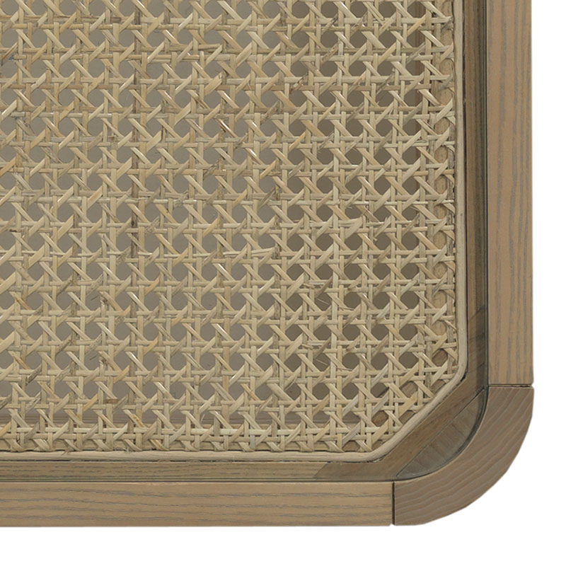 Clean lines and minimalism define the design of the playa table, an inset glass top is accented with open woven cane beneath elevated on gently quarter rounded legs.Material: Ash solids, natural cane, and 3/8" tempered glass