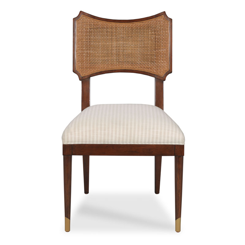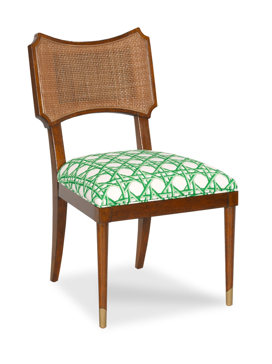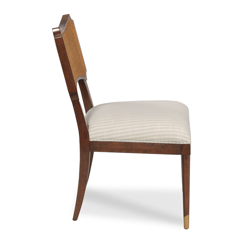 A handsome chair adapted from French Empire styles from the 19th Century. A shaped back is incised with linear natural cane above an upholstered seat elevated on tapering legs.Material: Hardwood Solids & Natural Cane