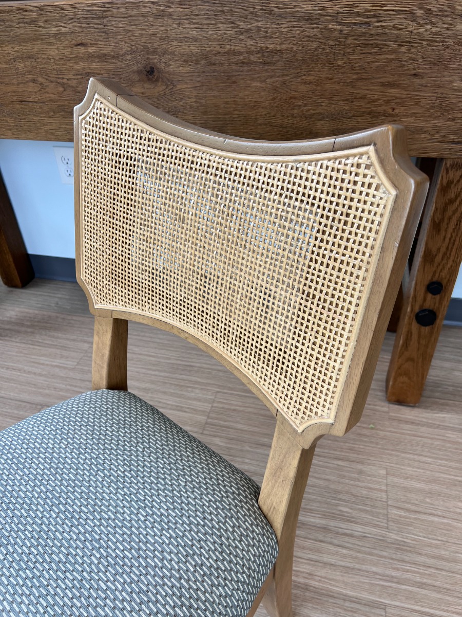 A handsome chair adapted from French Empire styles from the 19th Century. A shaped back is incised with linear natural cane above an upholstered seat elevated on tapering legs. Upholstered in COM Taylor King Morse Mint.Material: hardwood solids and natural cane