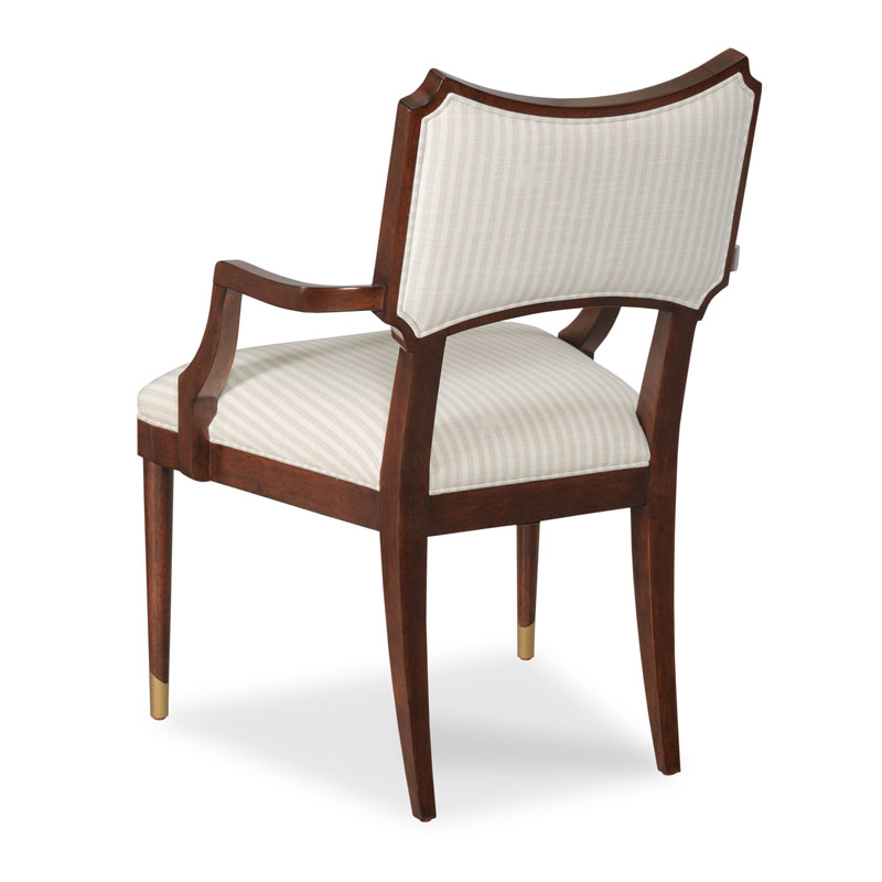 A handsome chair adapted from French Empire styles from the 19th Century. A shaped back is upholstered between curved arms above an upholstered seat elevated on tapering legs.Material: Hardwood Solids