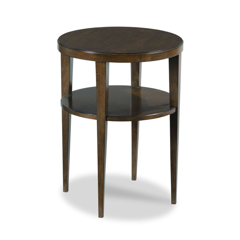 A graceful table with neo-classic roots has a round top resting over four squared tapered posts joined by a middle shelf.Material: Hardwood solids and walnut veneer