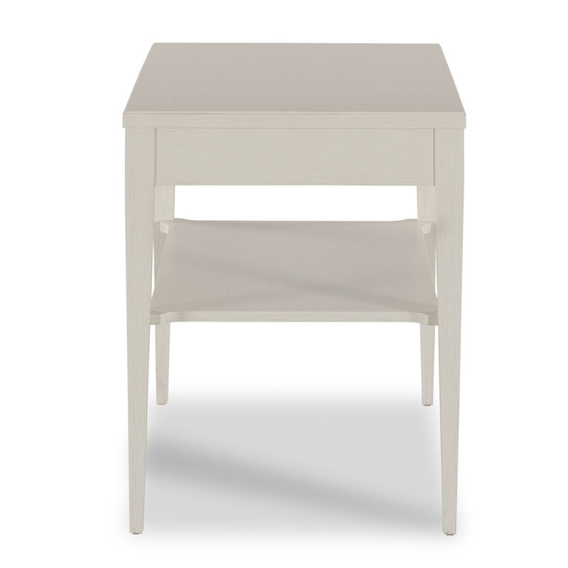 A graceful table with neo-classic roots with a rectangular top resting over an apron rail drawer and four squared tapered posts joined by a low shelf.Material: Hardwood solids