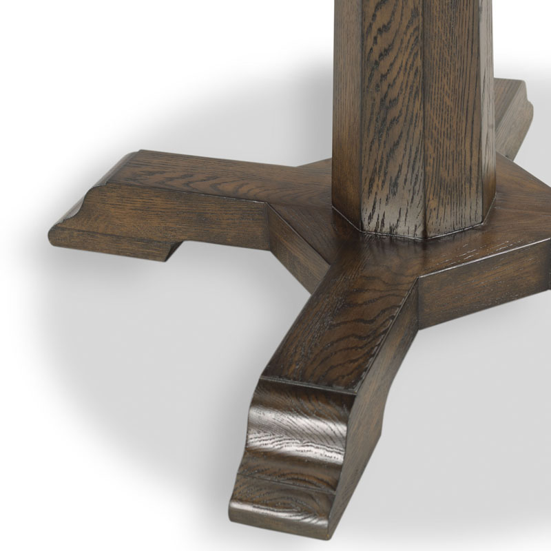 Designed in the spirit of the Gothic Revival style made popular in the 19th Century by Augustus Welby Northmore Pugin. A round veneered top rests over an angled center post and brackets joined by an X base.Material: Acacia solids and cherry veneer