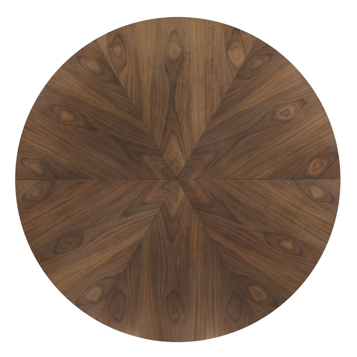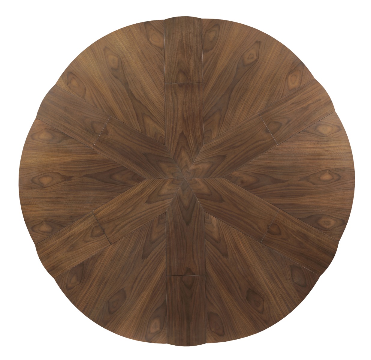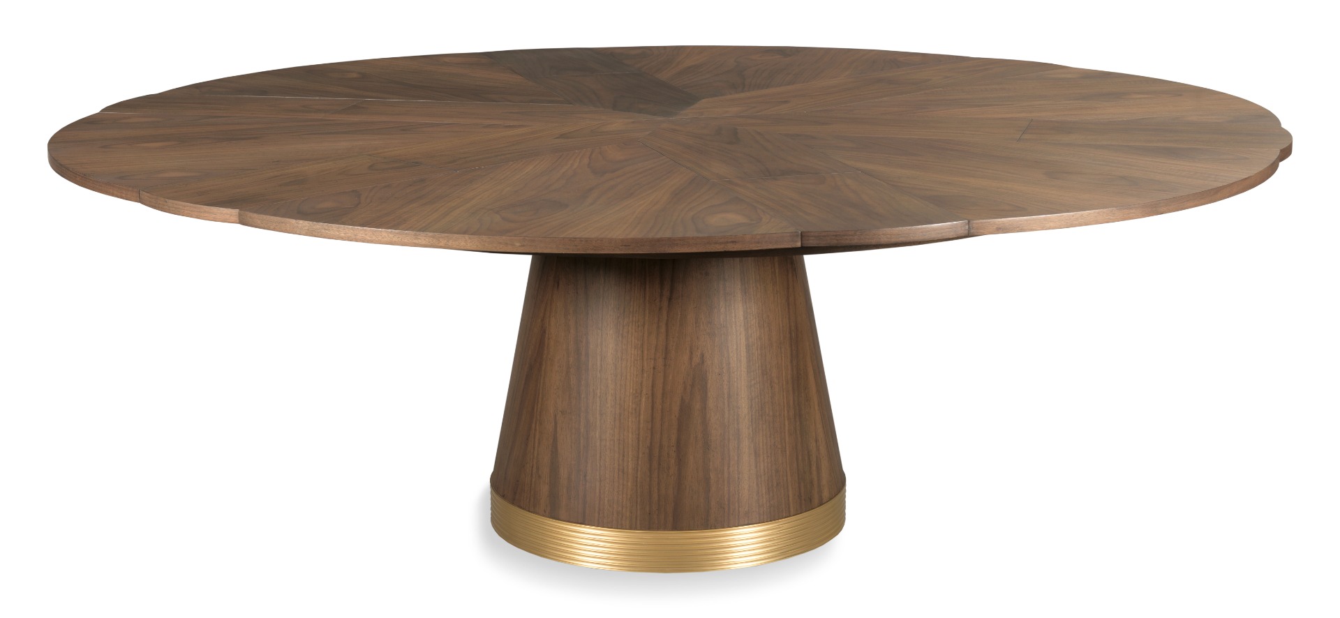 A wonderful table that expands using a patented mechanism dating back to 1835 by Johnstone, Jupe & Company. The table has six self-storing leaves to 84.5” diameter at its largest and 66” when it is closed. The top is elevated on a central round tapering column that terminates to a brass ring.Material: hardwood solids and walnut veneer and brass accents