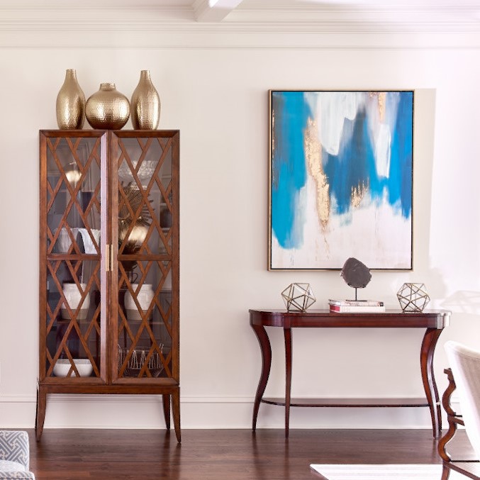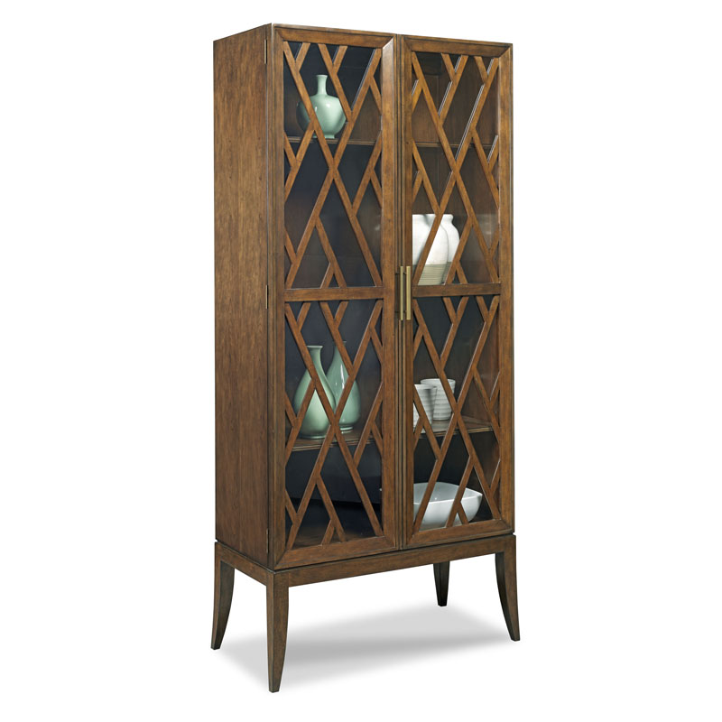 A striking Display Cabinet featuring a pierced fretwork overlaid on glass doors with refined brass pulls. This cabinet has two adjustable shelves with a stationary center shelf.Material: Hardwood solids and cherry veneer