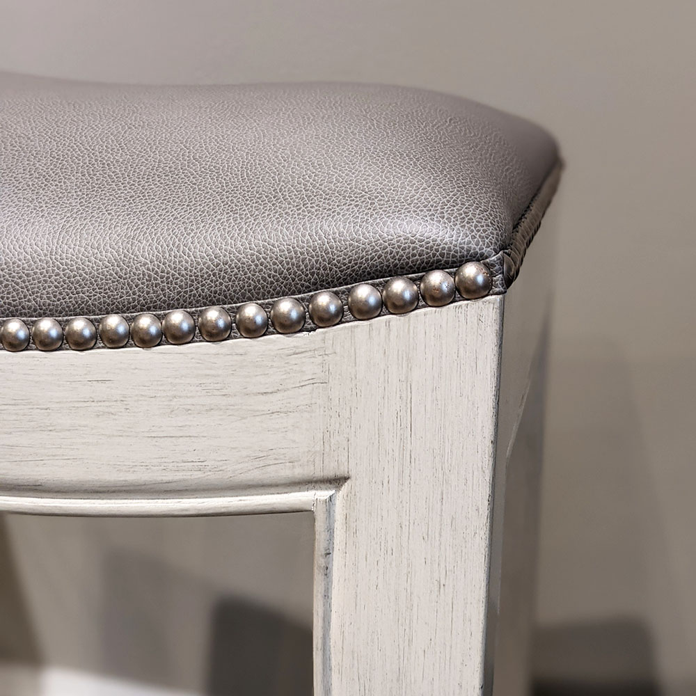 Woodbridge Gray Vinyl is fitted over shaped seat rails that are raised by splayed tapering legs.Material: Hardwood solids