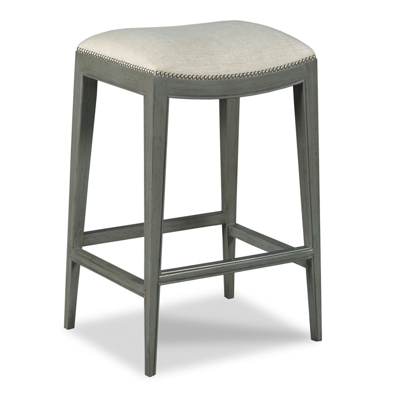 An upholstered seat in linen is fitted over shaped seat rails that are raised by splayed tapering legs joined by stretchers.Material: Hardwood solids