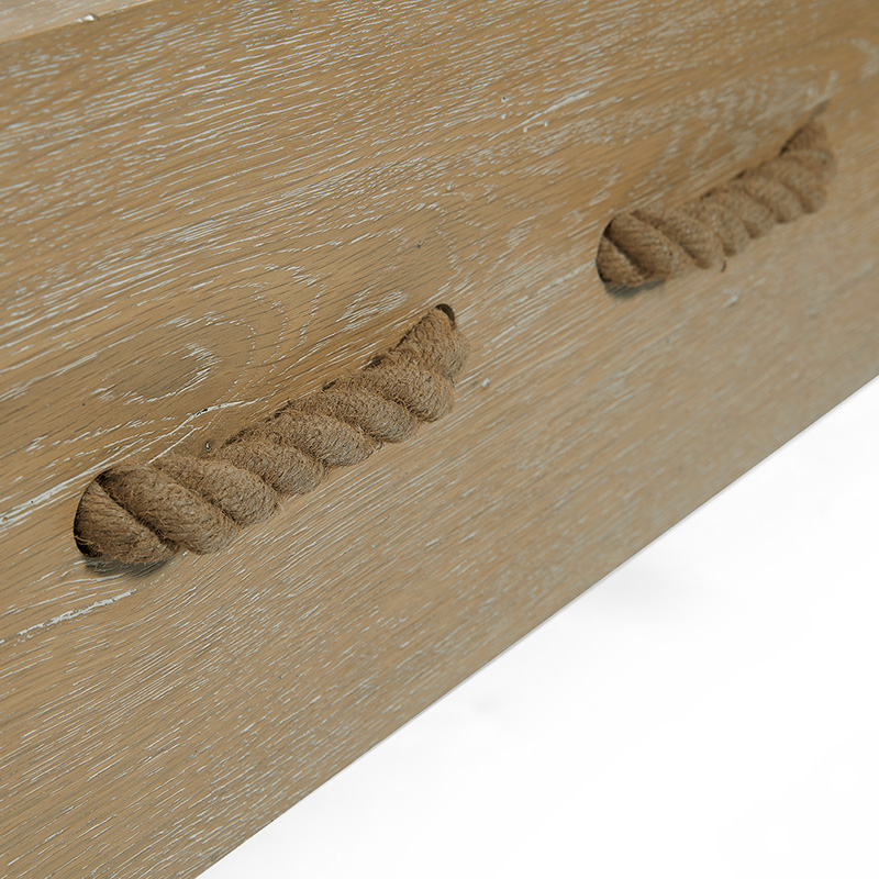 The posts elevate a low ram's head shaped headboard over side rails that are fitted with a rope detail simulating rope bedding supports that were used during the 18th century. During the period, ropes were tightened periodically as they stretched from use. Thus, the expression "sleep tight" was born. Bunkie board in lieu of traditional boxsping is recommended.Material: Solid Oak & Veneer