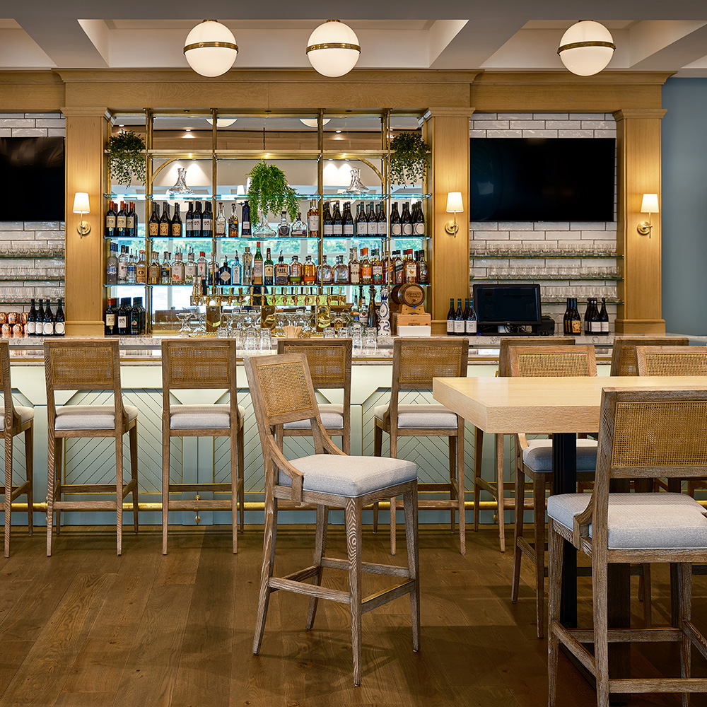 Clean lines abound with this wonderful bar seat design. A framed linear modern cane is fitted into the back over a tight upholstered seat elevated on gracefully tapering legs that are joined by low stretchers.Material: Oak Solids with natural cane finished in Vintage