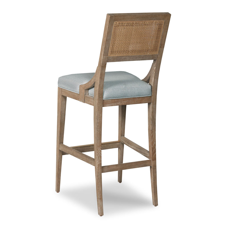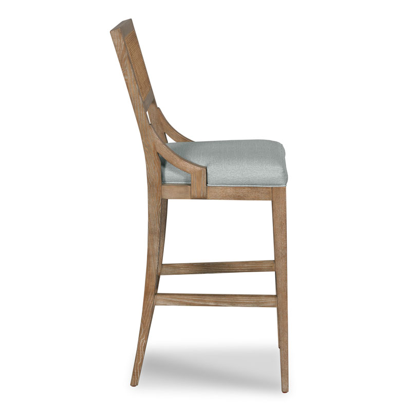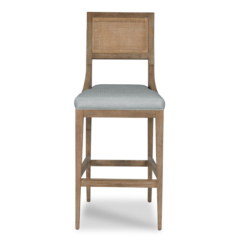 Clean lines abound with this wonderful counter seat design. A framed linear modern cane is fitted into the back over a tight upholstered seat elevated on gracefully tapering legs that are joined by low stretchers.Material: Oak Solids with natural cane finished in Vintage