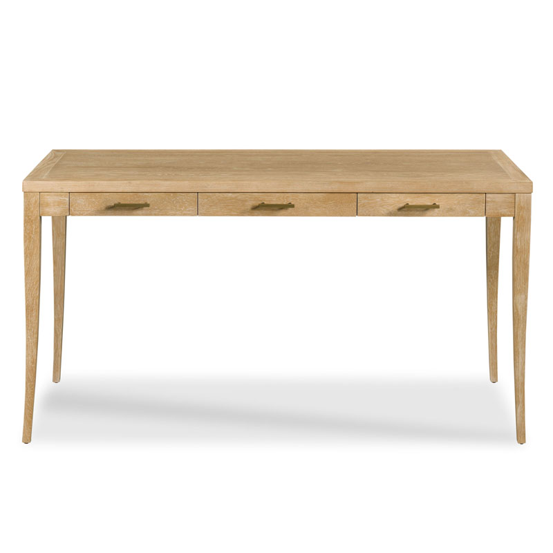 A refined, mid-century inspired writing desk crafted in rich hardwood with elegant tapered legs and three smooth-gliding drawers featuring sleek brass pulls.Material: Hardwood solids and oak veneer