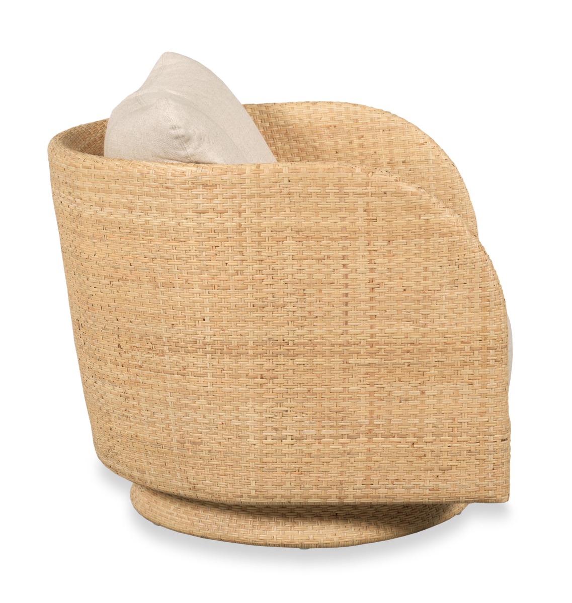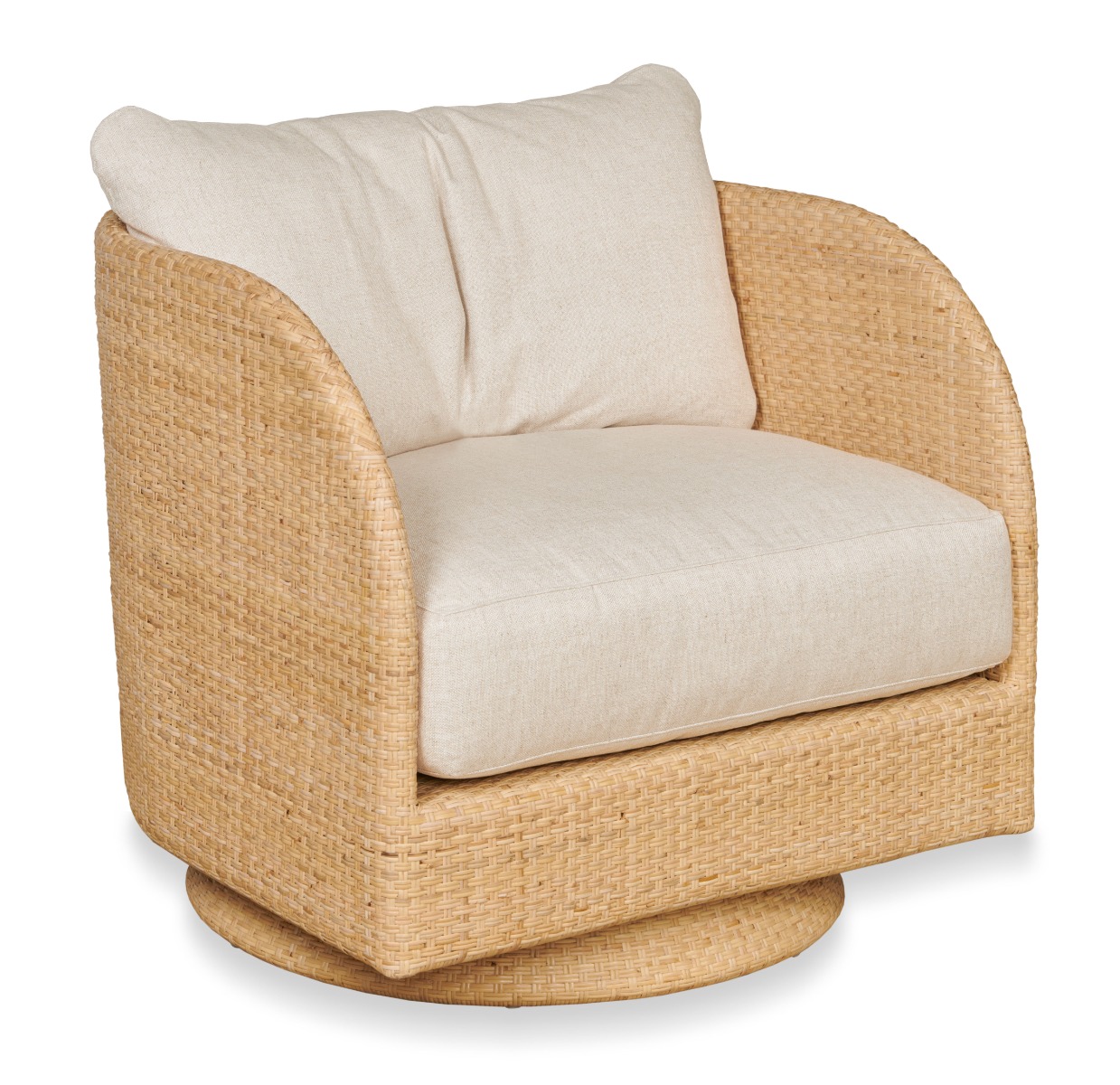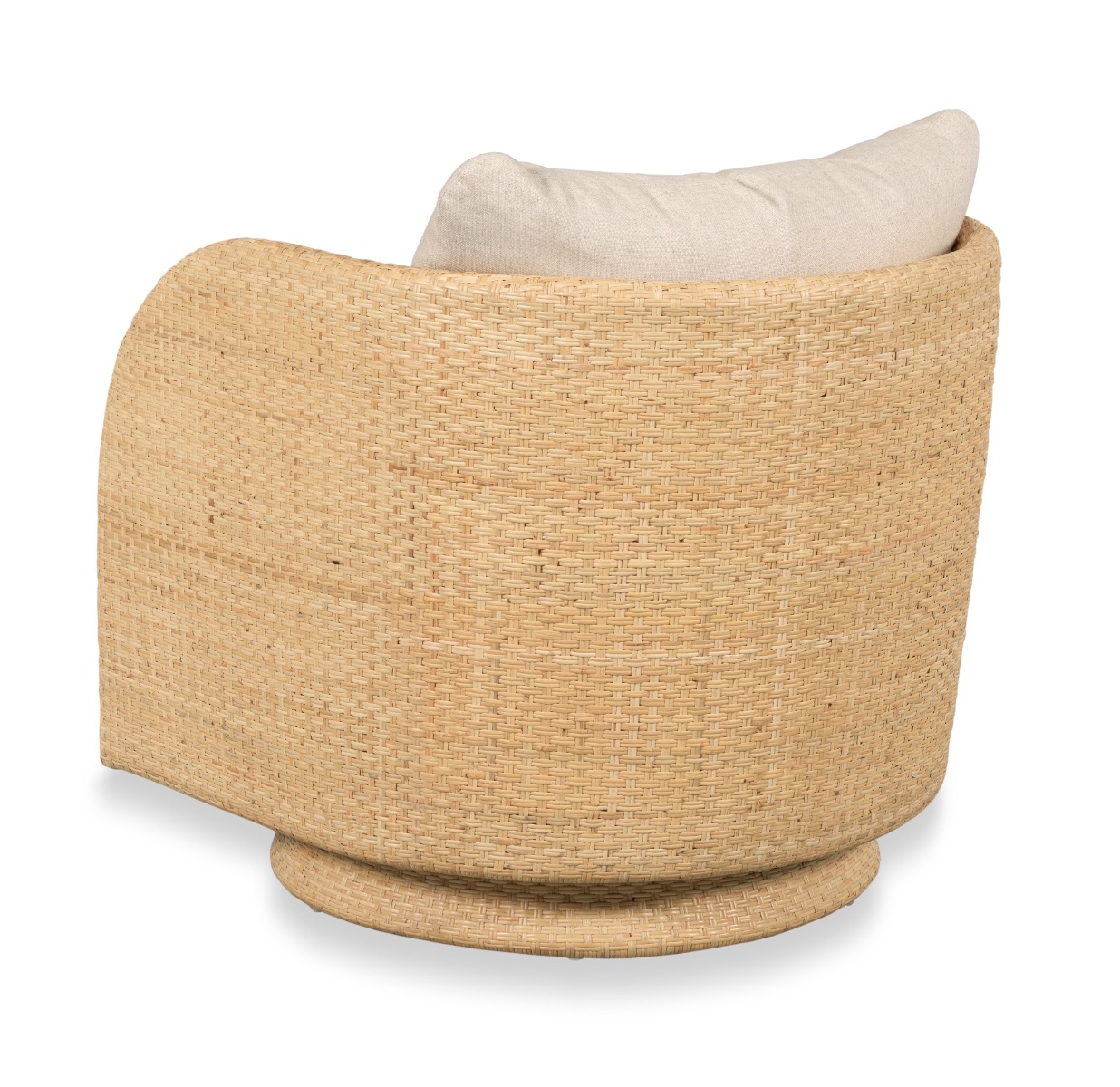 A wonderful lounge chair with a barrel back design crafted from natural rattan that is fitted with a loose cushioned back over an ample upholstered seat cushion over a swivel base.Material: Natural Rattan