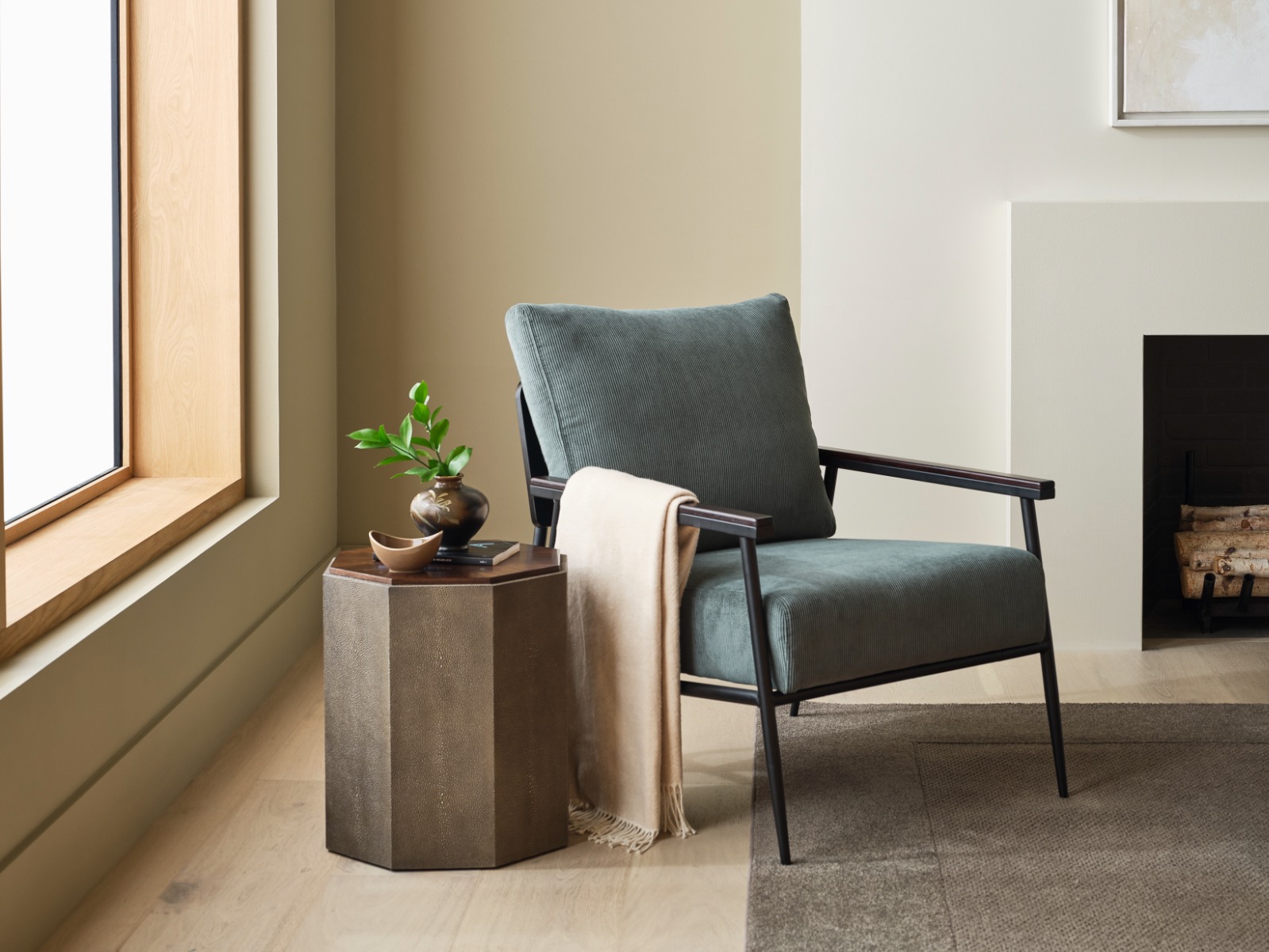 An octagonal top is veneered with American walnut over faux shagreen overlaid side panels.Material: Walnut solids with faux shagreen