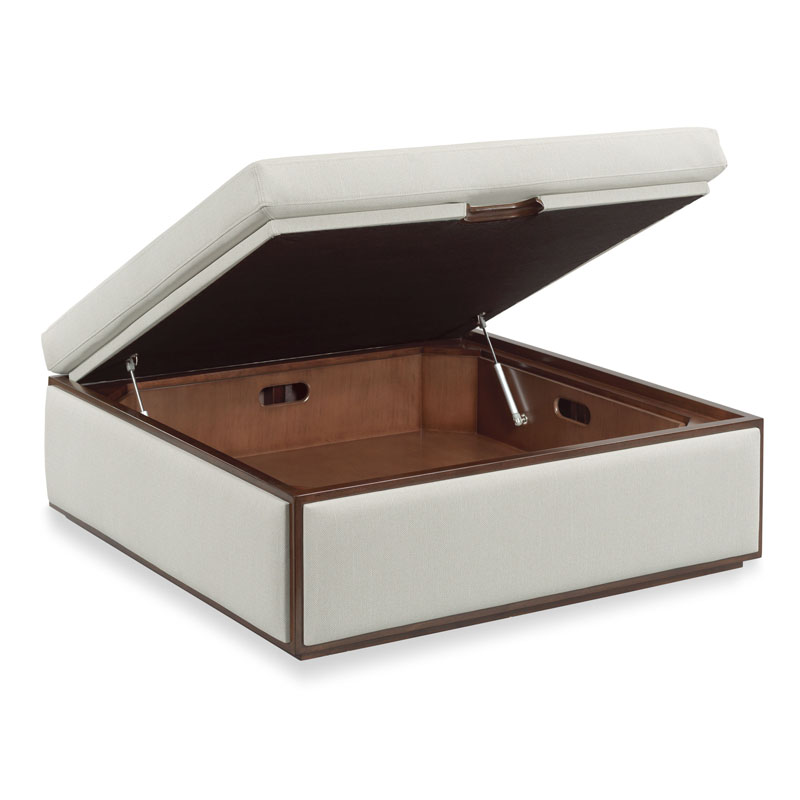 An extraordinary ottoman to store games and blankets underneath the upholstered top cushion which rests above side rails that are upholstered and slightly padded. The case features concealed casters for easy movement.Material: Hardwood Solids