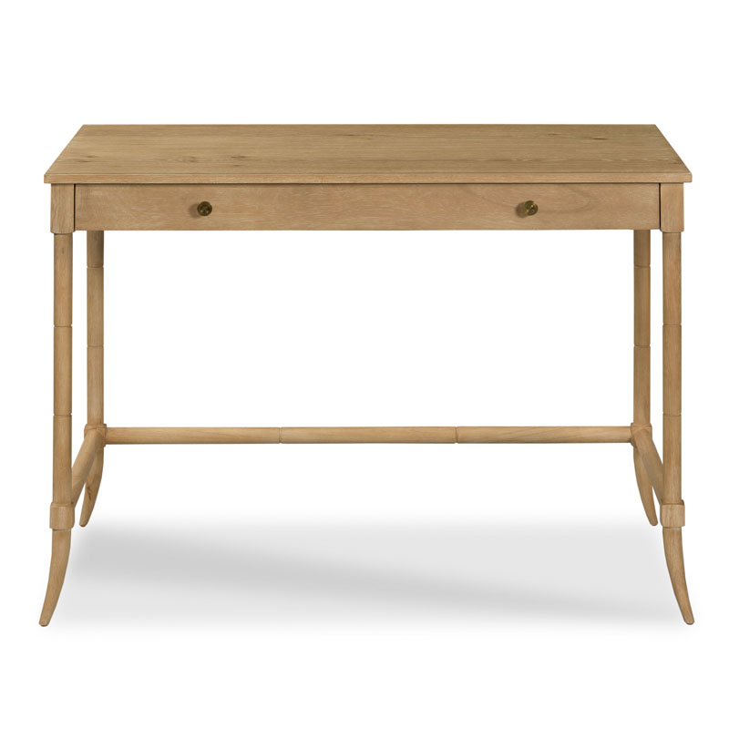 A handsome table to have at your bedside for laptop use or writing. The design is adapted from 18th Century English originals from the regency period. A rectangular top is veneered with quartered oak over turned faux bamboo flared legs supporting an apron rail drawer.Material: Oak solids and veneer