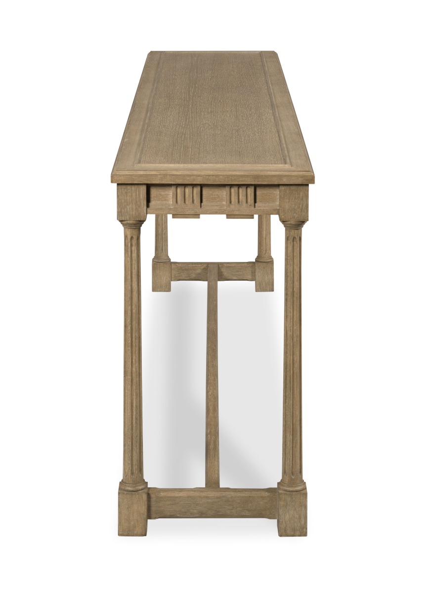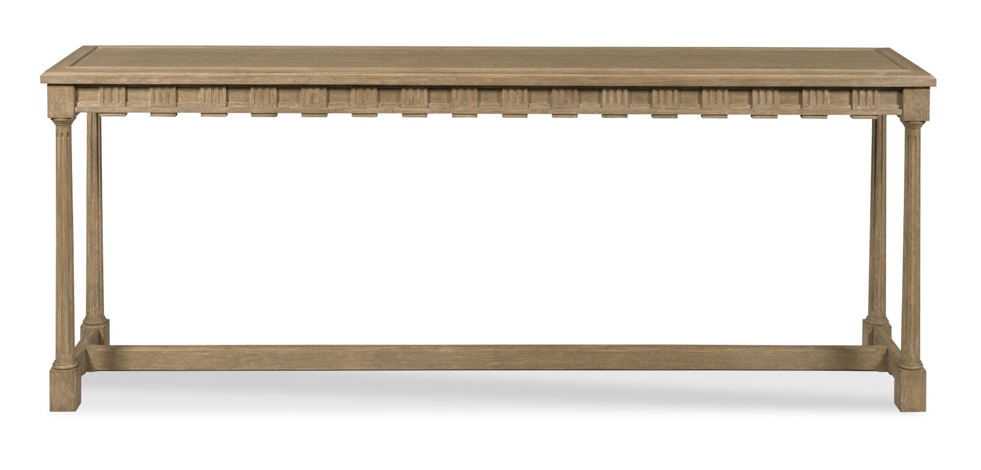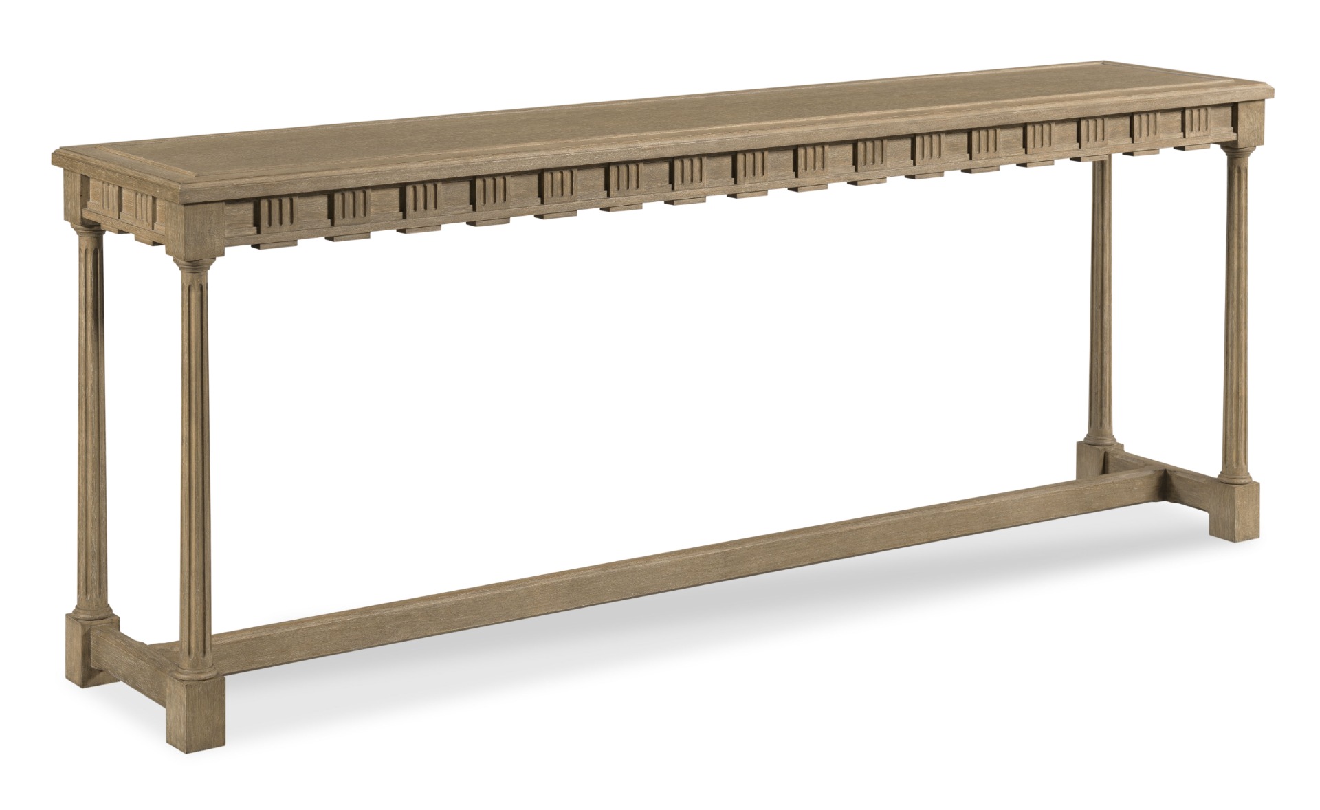 This stately console features a grand scale and versatility with a center stretcher and is finshed with detailed fretwork on both sides as a sofa table or floating option in any room.Material: hardwood solids and oak veneer